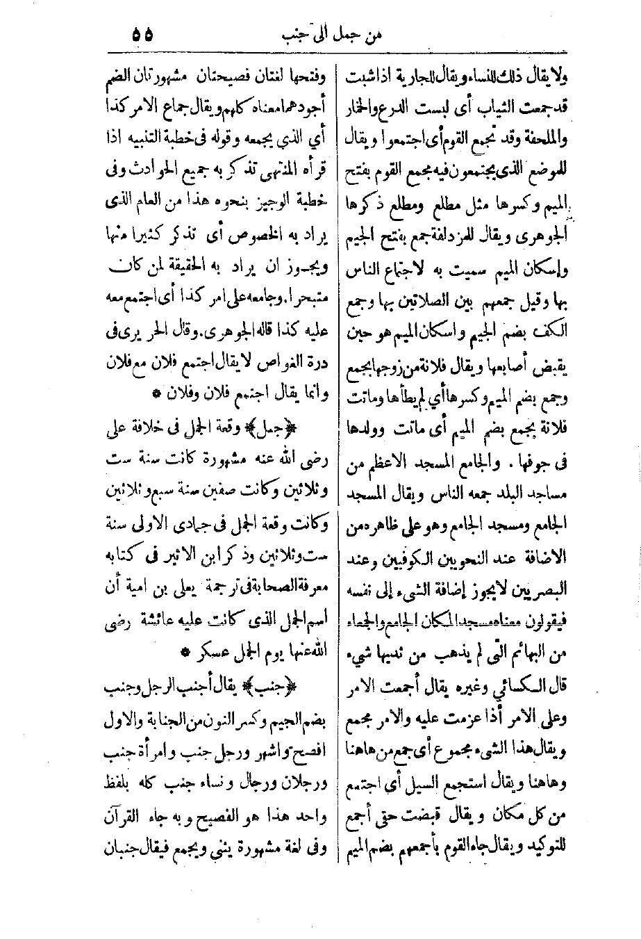 ولا يقال ذلك للنساء، ويقال للجارية إذا شبت، قد جمعت الثياب أي لبست الدرع والخمار والملحفة، وقد تجمع القوم أي اجتمعوا، ويقال للموضع الذي يجتمعون فيه مجمع القوم، بفتح الميم وكسرها مثل مطلع، ومطلع ذكرها الجوهري، ويقال للمزدلفة: جمع بفتح الجيم وإسكان الميم سميت به لاجتماع الناس بها، وقيل: جمعهم بين الوقوف بها، وجمع الكف بضم الجيم وإسكان الميم هو حين يقبض أصابعها، ويقال: فلانه من زوجها بجمع، وجمع بضم الميم وكسرها أي لم يطأها، وماتت فلانة بجمع بضم الميم أي ماتت وولدها في جوفها، والجامع المسجد الأعظم من مساجد البلد جمعه الناس، ويقال: المسجد الجامع ومسجد الجامع وهو على ظاهره من الإضافة، عند النحويين الكوفيين وعند البصريين لا يجوز إضافة الشيء إلى نفسه، فيقولون: معناه مسجد المكان الجامع والجمعاء من البهائم التي لم يذهب من ثديها شيء، قال الكسائى وغيره: يقال: أجمعت الأمر وعلى الأمر إذا عزمت عليه والأمر مجمع، ويقال: هذا الشيء مجموع أي جمع من ها هنا وها هنا.
