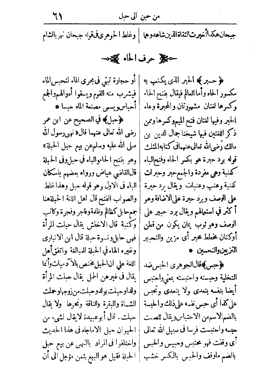 حبل: في الصحيح عن ابن عمر رضي الله تعالى عنهما قال: نهى رسول الله - صَلَّى اللهُ عَلَيْهِ وَسَلَّمَ - عن بيع حبل الحبلة، وهو بفتح الحاء والباء في حبل وفي الحبلة.