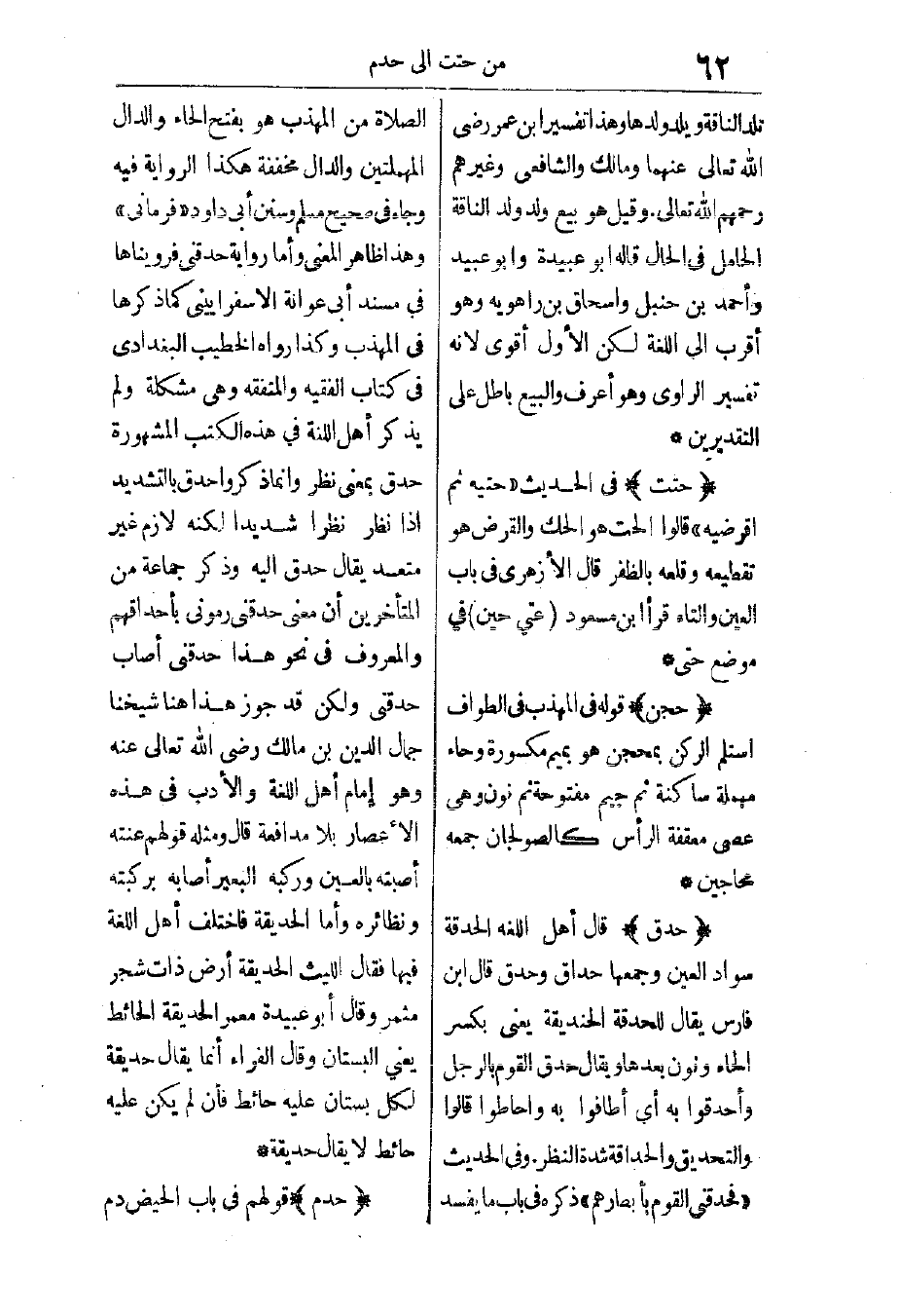 وفي الحديث: "فحدقني القوم بأبصارهم" ذكره في باب ما يفسد الصلاة من المهذب هو بفتح الحاء والدال المهملتين والدال مخففة، هكذا الرواية فيه. وجاء في صحيح مسلم وسنن أبي داود "فرماني"، وهذا ظاهر المعنى، وأما رواية "حدقني" فرويناها في مسند أبي عوانة الاسفراييني كما ذكرها في المهذب. وكذا رواه الخطيب البغدادي في كتاب الفقيه والمتفقه وهي مشكلة، ولم يذكر أهل اللغة في هذه الكتب المشهورة "حدقني" بمعنى نظر، وإنما ذكروا حدق بالتشديد إذا نظر نظرًا شديدًا لكنه لازم غير متعد. يقال: حدق إليه.