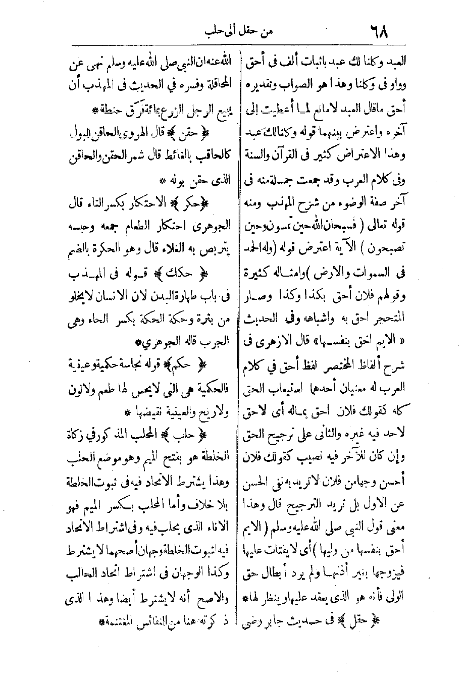 حقل: في حديث جابر رضي الله عنه: "أن النبي - صَلَّى اللهُ عَلَيْهِ وَسَلَّمَ - نهى عن المحاقلة"، وفسره في الحديث في المهذب: "أن يبيع الرجل الزرع بمائة فرق حنطة".