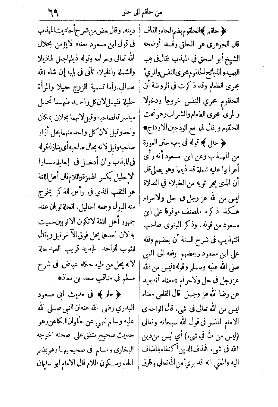 حلو: في حديث أبي مسعود البدري رضي الله عنه: "أن النبي - صَلَّى اللهُ عَلَيْهِ وَسَلَّمَ - نهى عن حلوان الكاهن"، وهو حديث صحيح متفق على صحته، أخرجه البخاري ومسلم في صحيحيهما، وهو بضم الحاء وسكون اللام. قال الإمام أبو سليمان