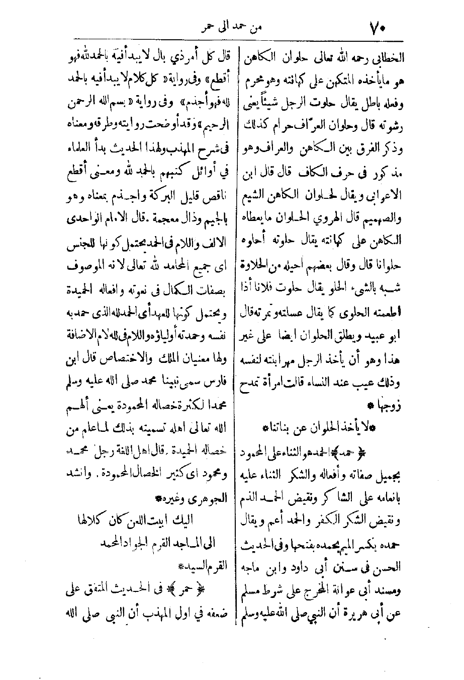 حمد: الحمد هو الثناء على المحمود بجميل صفاته، وأفعاله، والشكر الثناء عليه بإنعامه على الشاكر، ونقيض الحمد الذم، ونقيض الشكر الكفر، والحمد أعم، ويقال: حمده بكسر الميم يحمده بفتحها، وفي الحديث الحسن في سنن أبي داود وابن ماجه ومسند أبي عوانة المخرج على شرط مسلم عن أبي هريرة: أن النبي - صَلَّى اللهُ عَلَيْهِ وَسَلَّمَ - قال: "كل أمر ذي بال لا يبدأ فيه بالحمد لله فهو أقطع"، وفي رواية: "كل كلام لا يبدأ فيه الحمد لله فهو أجذم"، وفي رواية "بسم الله الرحمن الرحيم".