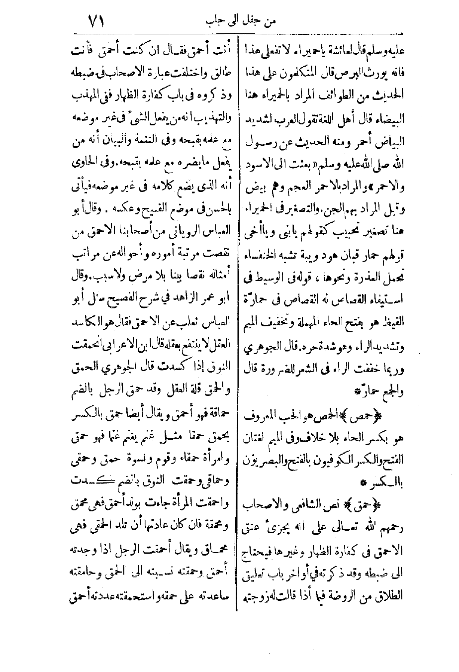 حمق: نص الشافعي والأصحاب رحمهم الله تعالى: على أنه يجزىء عتق الأحمق في كفارة الظهار وغيرها، فيحتاج إلى ضبطه. وقد ذكرته في أواخر باب تعليق الطلاق من الروضة: فيما إذا قالت له زوجته: أنت أحمق، فقال: إن كنت أحمق فأنت طالق.