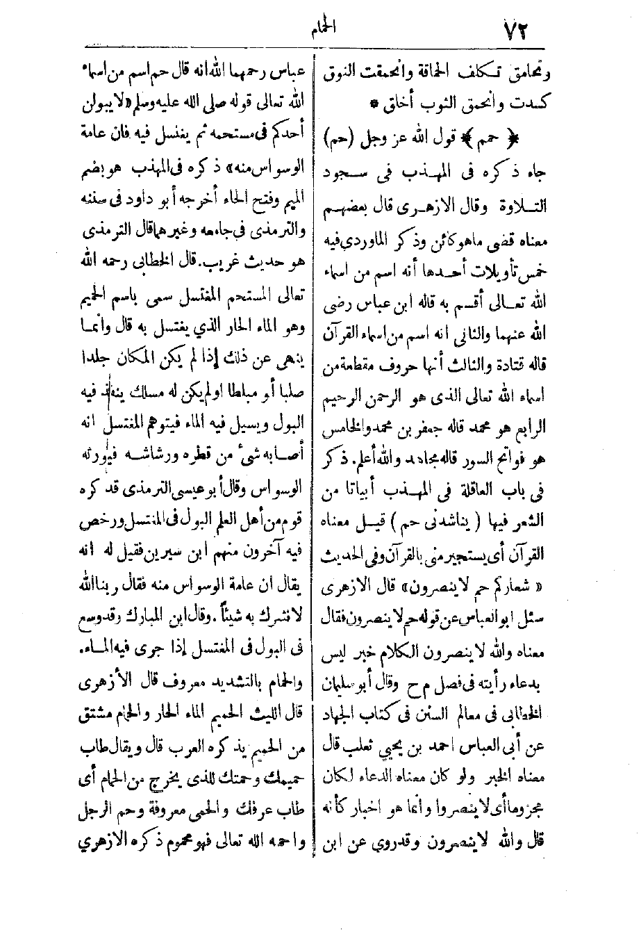 حمم: قول الله عز وجل: {حم} جاء ذكره في المهذب في سجود التلاوة، وقال الأزهري: قال بعضهم: معناه قضى ما هو كائن. وذكر الماوردي فيه خمس تأويلات، أحدها: أنه اسم من أسماء الله تعالى أقسم به قاله ابن عباس رضي الله عنهما، والثاني: أنه اسم من أسماء القرآن قاله قتادة، والثالث: أنها حروف مقطعة من أسماء الله تعالى الذي هو الرحمن الرحيم، الرابع: هو محمد قاله جعفر بن محمد، والخامس: هو فواتح السور قاله مجاهد، والله أعلم.