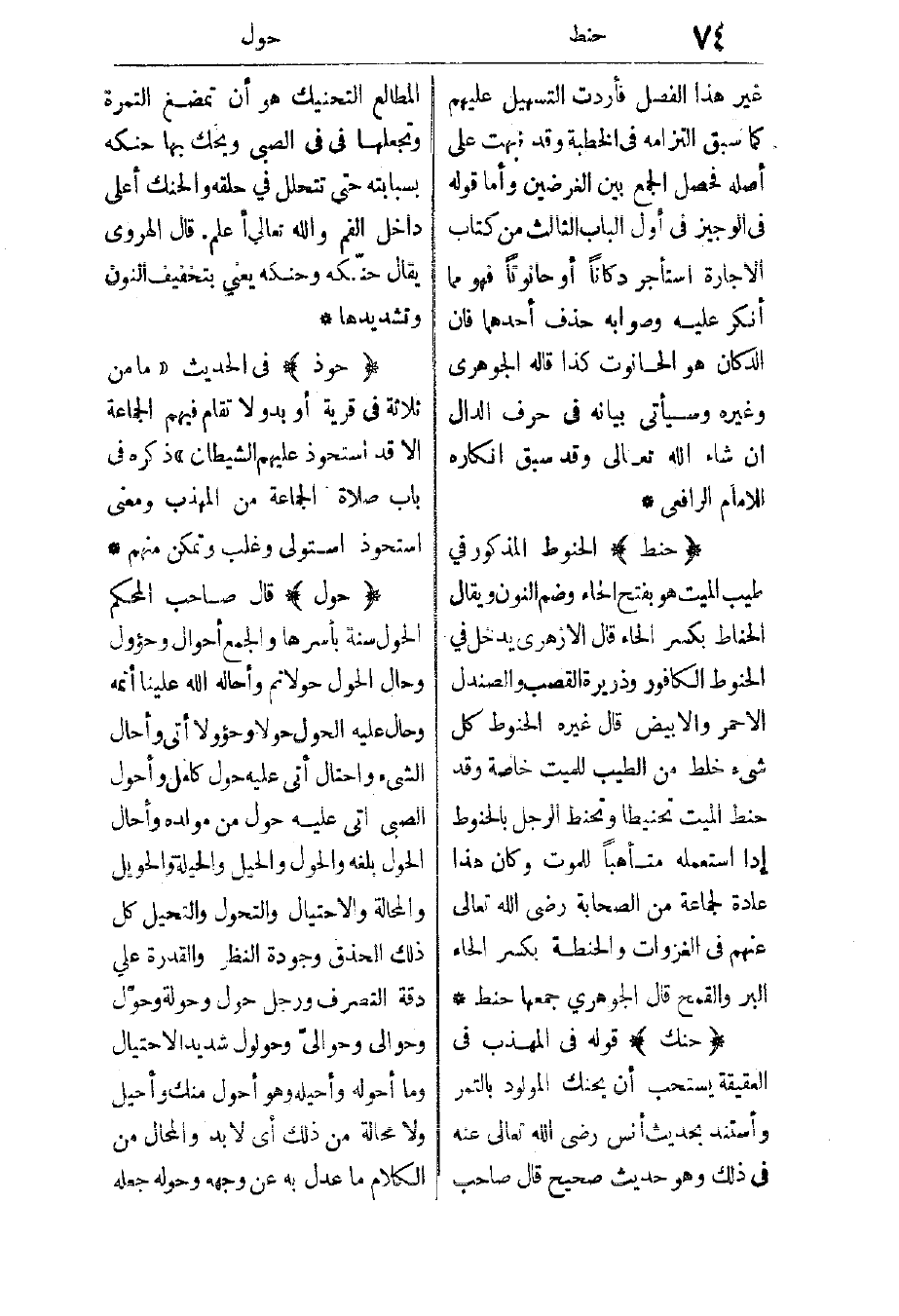 حنط: الحنوط المذكور في طيب الميت هو بفتح النون، ويقال: الحناط بكسر الحاء. قال الازهري: يدخل في الحنوط الكافور، وذريرة القصب، والصندل الأحمر والأبيض. قال غيره: الحنوط كل شيء خلط من الطيب للميت خاصة، وقد حنط الميت تحنيطا، وتحنط الرجل بالحنوط، إذا استعمله متأهبا للموت، وكان هذا عادة لجماعة من الصحابة رضي الله تعالى عنهم في الغزوات، والحنطة بكسر الحاء البر والقمح. قال الجوهري: جمعها حنط.