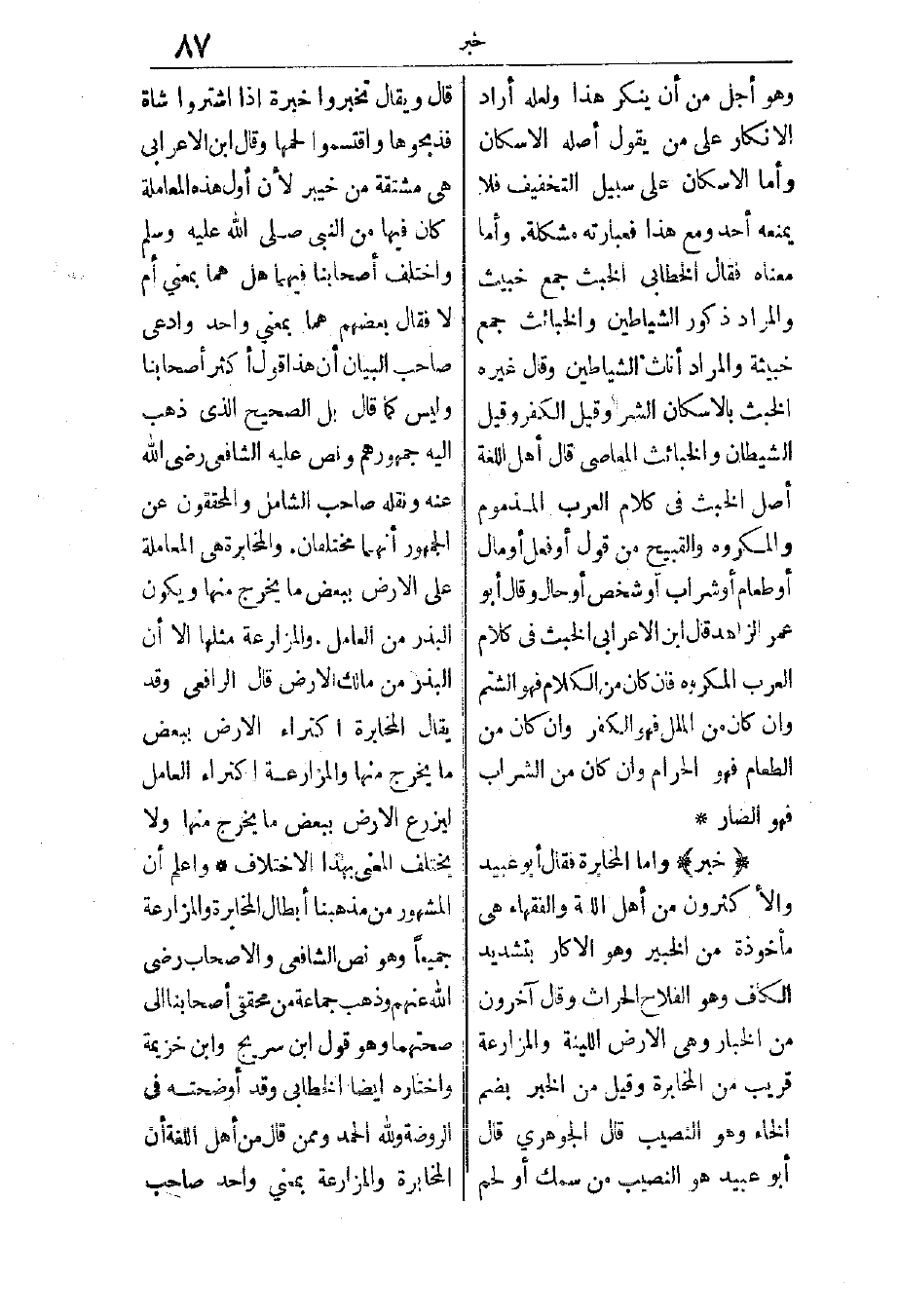 وأعلم أن المشهور من مذهبنا إبطال المخابرة، والمزارعة جميعًا، وهو نص الشافعي والأصحاب رضي الله عنهم، وذهب جماعة من محققي أصحابنا إلى صحتهما، وهو قول ابن سريج وابن خزيمة، واختاره أيضا الخطابي، وقد أوضحته في الروضة، ولله الحمد. وممن قال من أهل اللغة: أن المخابرة والمزارعة بمعنى واحد صاحب