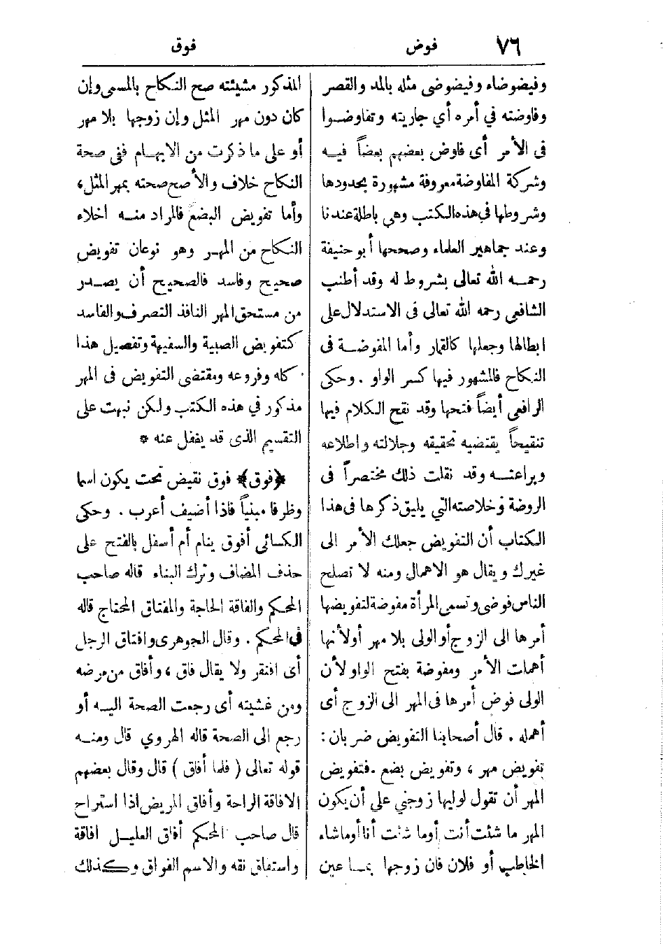 وفيضوضاء وفيضوض مثله بالمد والقصر، وفاوضته في أمره أي: جاريته، وتفاوضوا في الأمر أي فاوض بعضهم بعضًا فيه، وشركة المفاوضة معروفة مشهورة بحدودها وشروطها في هذه الكتب، وهي باطلة عندنا وعند جماهير العلماء، وصححها أبو حنيفة رحمه الله تعالى بشروط له، وقد أطنب الشافعي رحمه الله تعالى في الاستدلال على إبطالها وجعلها كالقمار، وأما المفوضة في النكاح فالمشهور فيها كسر الواو.