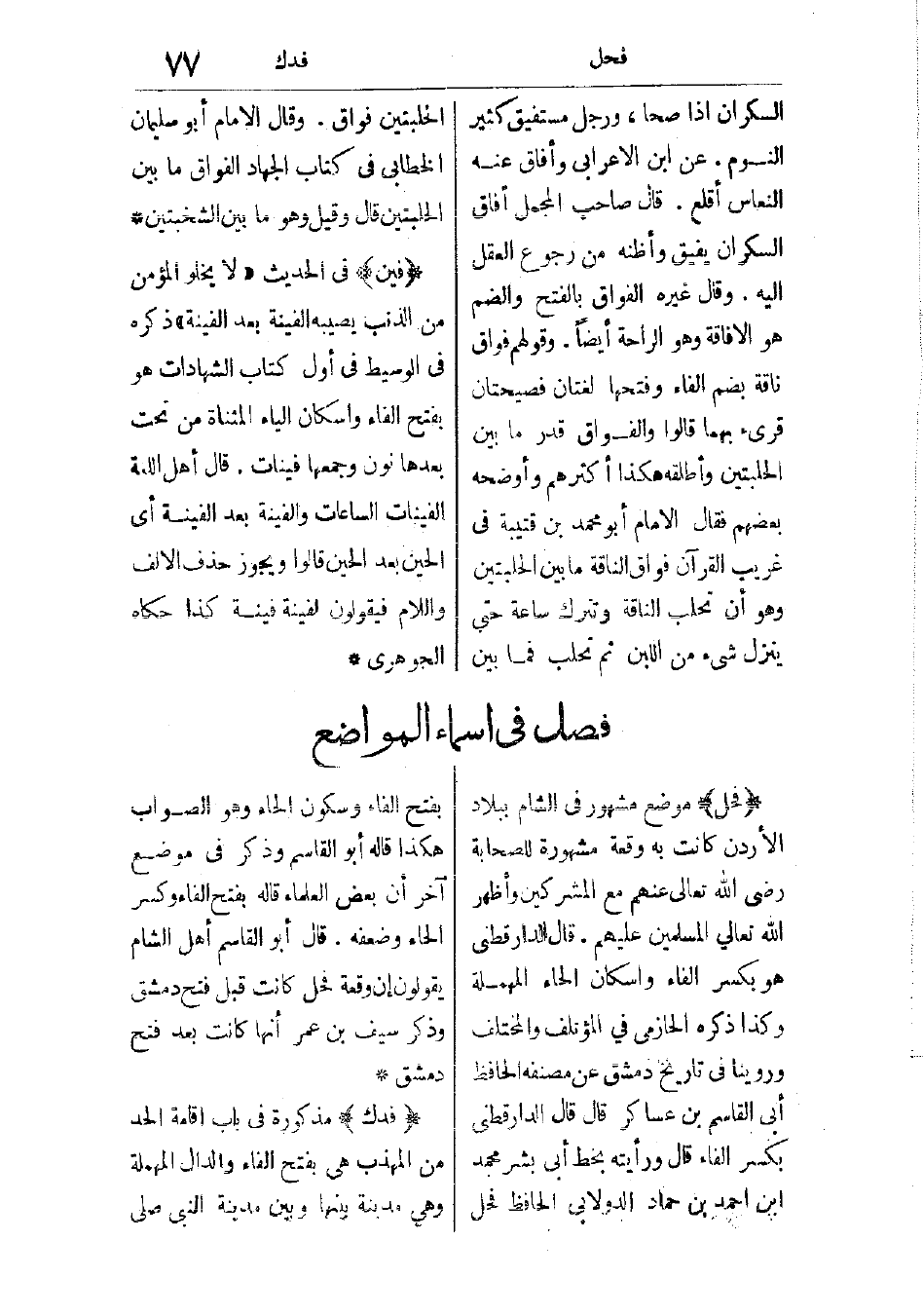 فدك: مذكورة في باب إقامة الحد من المهذب هي بفتح الفاء والدال المهملة، وهي مدينة بينها وبين مدينة النبي - صلّى