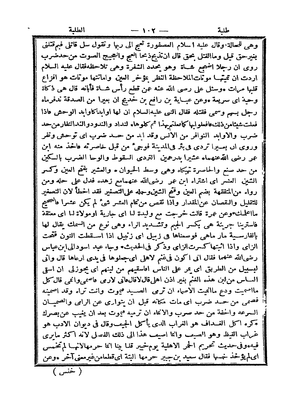(ن د د) : وَعَنْ عَبَايَةَ بْنِ رَافِعِ بْنِ خَدِيجٍ «أَنَّ بَعِيرًا مِنْ الصَّدَقَةِ نَدَّ فَرَمَاهُ رَجُلٌ بِسَهْمٍ وَسَمَّى فَقَتَلَهُ فَقَالَ النَّبِيُّ - عَلَيْهِ السَّلَامُ - إنَّ لَهَا أَوَابِدَ كَأَوَابِدِ الْوَحْشِ فَإِذَا فَعَلْت شَيْئًا مِنْ ذَلِكَ فَافْعَلُوا بِهَا كَمَا فَعَلْتُمْ بِهَذَا ثُمَّ كُلُوهَا» النِّدَادُ وَالنُّدُودُ وَالنَّدُّ النِّفَارُ مِنْ حَدِّ ضَرَبَ وَالْأَوَابِدُ النَّوَافِرُ مِنْ الْإِنْسِ وَقَدْ أَبَدَ مِنْ حَدِّ ضَرَبَ أَيْ تَوَحَّشَ وَنَفَرَ وَرُوِيَ أَنَّ بَعِيرًا تَرَدَّى فِي بِئْرٍ فِي الْمَدِينَةِ فَوُجِئَ مِنْ قِبَلِ خَاصِرَتِهِ فَأَخَذَ مِنْهُ ابْنُ عُمَرَ - رَضِيَ اللَّهُ عَنْهُمَا - عَشِيرًا بِدِرْهَمَيْنِ التَّرَدِّي السُّقُوطُ وَالْوَجَأُ الضَّرْبُ بِالسِّكِّينِ مِنْ حَدِّ صَنَعَ وَالْخَاصِرَةُ تهيكاه وَهِيَ وَسَطُ الْحَيَوَانِ وَالْعَشِيرُ بِفَتْحِ الْعَيْنِ وَكَسْرِ الشِّينِ الْعُشْرَ أَيْ اشْتَرَاهُ ابْنُ عُمَرَ - رَضِيَ اللَّهُ عَنْهُمَا - مَعَ زُهْدِهِ فَدَلَّ عَلَى حِلِّهِ وَمَنْ رَوَاهُ مِنْ الْمُتَفَقِّهَةِ بِضَمِّ الْعَيْنِ وَفَتْحِ الشِّينِ وَحَمَلَهُ عَلَى التَّصْغِيرِ فَقَدْ أَخْطَأَ لِأَنَّ التَّصْغِيرَ لِلتَّقْلِيلِ وَالنُّقْصَانِ عَنْ الْمِقْدَارِ وَإِذَا نَقَصَ مِنْ تَمَامِ الْعُشْرِ شَيْءٌ لَمْ يَكُنْ عُشْرًا فَالصَّحِيحُ مَا أَعْلَمْتُك.