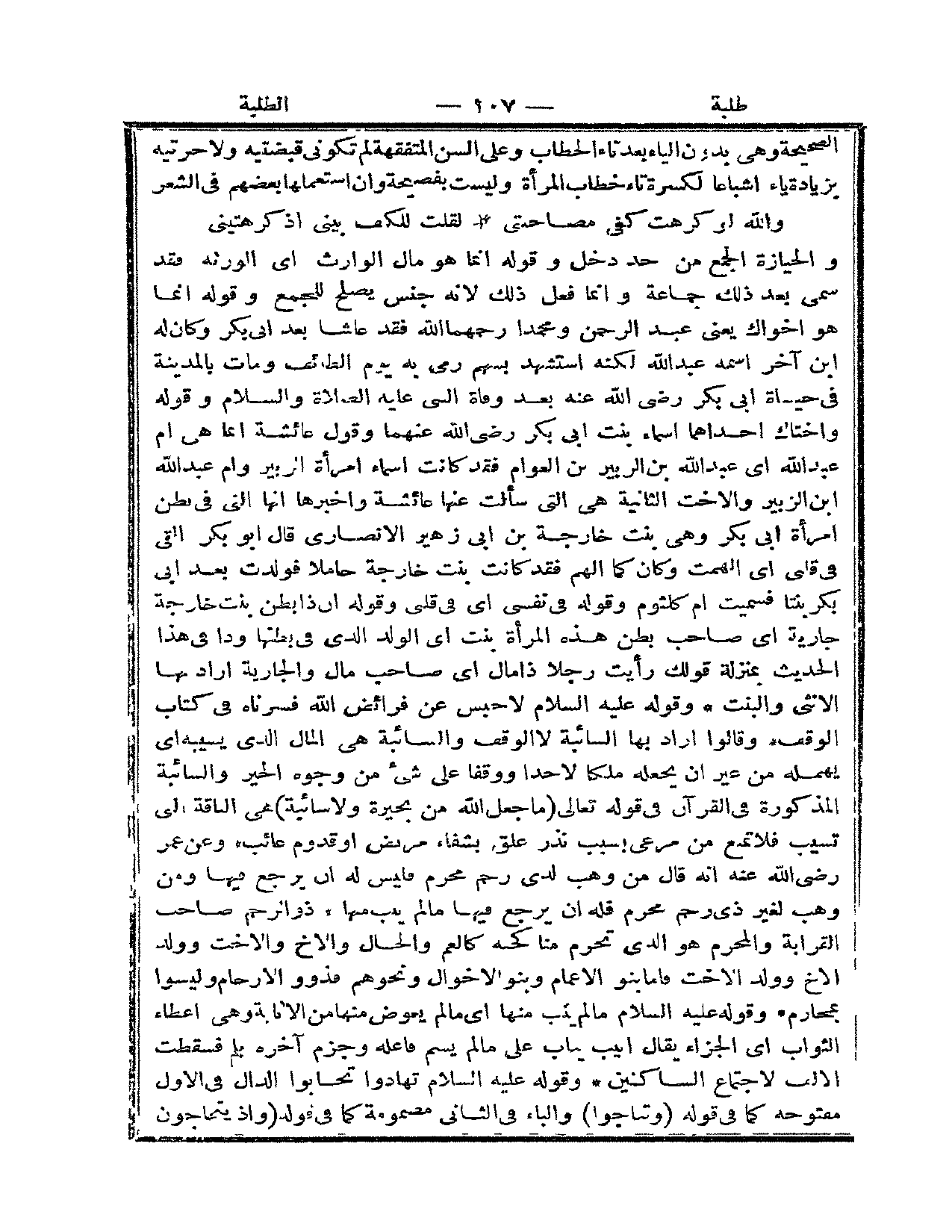 وَالْحِيَازَةُ الْجَمْعُ مِنْ حَدِّ دَخَلَ وَقَوْلُهُ إنَّمَا هُوَ مَالُ الْوَارِثِ أَيْ الْوَرَثَةِ فَقَدْ سَمَّى بَعْدَ ذَلِكَ جَمَاعَةً وَإِنَّمَا فَعَلَ ذَلِكَ لِأَنَّهُ جِنْسٌ يَصْلُحُ لِلْجَمْعِ وَقَوْلُهُ إنَّمَا هُمَا أَخَوَاك يَعْنِي عَبْدَ الرَّحْمَنِ وَمُحَمَّدًا رَحِمَهُمَا اللَّهُ فَقَدْ عَاشَا بَعْدَ أَبِي بَكْرٍ وَكَانَ لَهُ ابْنٌ آخَرُ اسْمُهُ عَبْدُ اللَّهِ لَكِنَّهُ اُسْتُشْهِدَ بِسَهْمٍ رُمِيَ بِهِ يَوْمَ الطَّائِفِ وَمَاتَ بِالْمَدِينَةِ فِي حَيَاةِ أَبِي بَكْرٍ - رَضِيَ اللَّهُ عَنْهُ - بَعْدَ وَفَاةِ النَّبِيِّ - عَلَيْهِ الصَّلَاةُ وَالسَّلَامُ - وَقَوْلُهُ وَأُخْتَاك إحْدَاهُمَا أَسْمَاءُ بِنْتُ أَبِي بَكْرٍ - رَضِيَ اللَّهُ عَنْهُمَا - وَقَوْلُ عَائِشَةَ إنَّمَا هِيَ أُمُّ عَبْدِ اللَّهِ أَيْ عَبْدِ اللَّهِ بْنِ الزُّبَيْرِ بْنِ الْعَوَّامِ فَقَدْ كَانَتْ أَسْمَاءُ امْرَأَةَ الزُّبَيْرِ وَأُمَّ عَبْدِ اللَّهِ بْنِ الزُّبَيْرِ وَالْأُخْتُ الثَّانِيَةُ هِيَ الَّتِي سَأَلَتْ عَنْهَا عَائِشَةُ وَأَخْبَرَهَا أَنَّهَا الَّتِي فِي بَطْنِ امْرَأَةِ أَبِي بَكْرٍ وَهِيَ بِنْتُ خَارِجَةَ بْنِ أَبِي زُهَيْرٍ الْأَنْصَارِيِّ قَالَ أَبُو بَكْرٍ أُلْقِيَ فِي قَلْبِي أَيْ أُلْهِمْت وَكَانَ كَمَا أُلْهِمَ فَقَدْ كَانَتْ بِنْتُ خَارِجَةَ حَامِلًا فَوَلَدَتْ بَعْدَ أَبِي بَكْرٍ بِنْتًا فَسُمِّيَتْ أُمَّ كُلْثُومٍ وَقَوْلُهُ فِي نَفْسِي أَيْ فِي قَلْبِي وَقَوْلُهُ إنَّ ذَا بَطْنِ بِنْتِ خَارِجَةَ جَارِيَةٌ أَيْ صَاحِبَ بَطْنِ هَذِهِ الْمَرْأَةِ بِنْتٌ أَيْ الْوَلَدُ الَّذِي فِي بَطْنِهَا وَذَا فِي هَذَا الْحَدِيثِ بِمَنْزِلَةِ قَوْلِك رَأَيْت رَجُلًا ذَا مَالٍ أَيْ صَاحِبَ مَالٍ وَالْجَارِيَةُ أَرَادَ بِهَا الْأُنْثَى وَالْبِنْتَ وَقَوْلُهُ - عَلَيْهِ السَّلَامُ - لَا حَبْسَ عَنْ فَرَائِضِ اللَّهِ فَسَّرْنَاهُ فِي كِتَابِ الْوَقْفِ.