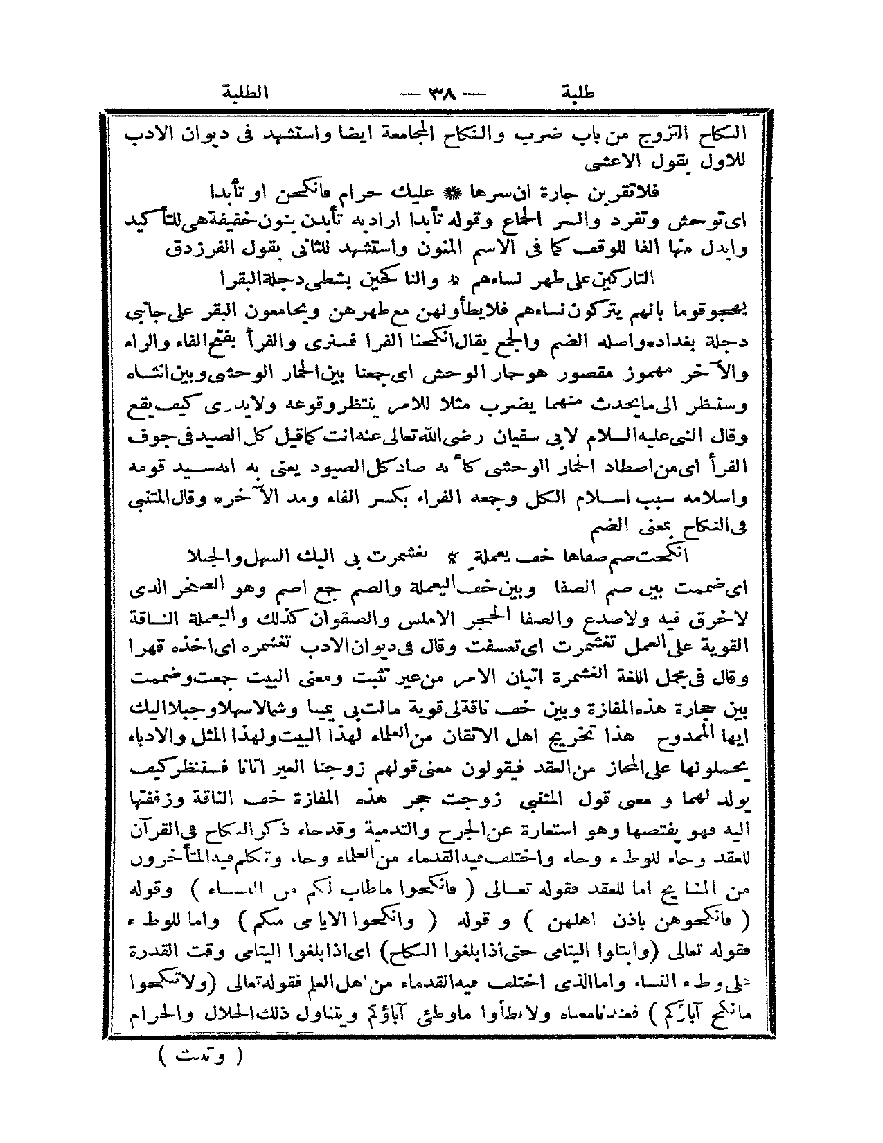 أَيْ ضَمَمْتُ بَيْنَ صُمِّ الصَّفَا وَبَيْنَ خُفِّ الْيَعْمَلَةِ وَالصُّمُّ جَمْعُ أَصَمَّ وَهُوَ الصَّخْرُ الَّذِي لَا خَرْقَ فِيهِ وَلَا صَدْعَ وَالصَّفَا الْحَجَرُ الْأَمْلَسُ وَالصَّفْوَانُ كَذَلِكَ وَالْيَعْمُلَةُ النَّاقَةُ الْقَوِيَّةُ عَلَى الْعَمَلِ تَغَشْمَرَتْ أَيْ تَعَسَّفَتْ وَقَالَ فِي دِيوَانِ الْأَدَبِ تَغَشْمَرَهُ أَيْ أَخَذَهُ قَهْرًا وَقَالَ فِي مُجْمَلِ اللُّغَةِ الْغَشْمَرَةُ إتْيَانُ الْأَمْرِ مِنْ غَيْرِ تَثَبُّتٍ وَمَعْنَى الْبَيْتِ جَمَعْتُ وَضَمَمْتُ بَيْنَ حِجَارَةِ هَذِهِ الْمَفَازَةِ وَبَيْنَ خُفِّ نَاقَةٍ لِي قَوِيَّةٍ مَالَتْ بِي يَمِينًا وَشِمَالًا سَهْلًا وَجَبَلًا إلَيْكَ أَيُّهَا الْمَمْدُوحُ هَذَا تَخْرِيجُ أَهْلِ الْإِتْقَانِ مِنْ الْعُلَمَاءِ لِهَذَا الْبَيْتِ وَلِهَذَا الْمَثَلِ وَالْأُدَبَاءُ يَحْمِلُونَهَا عَلَى الْمَجَازِ مِنْ الْعَقْدِ فَيَقُولُونَ مَعْنَى قَوْلِهِمْ زَوَّجْنَا الْعَيْرَ أَتَانًا فَسَنَنْظُرُ كَيْفَ يُولَدُ لَهُمَا وَمَعْنَى قَوْلِ الْمُتَنَبِّي زَوَّجْتُ حَجَرَ هَذِهِ الْمَفَازَةِ خُفَّ النَّاقَةِ وَزَفَفْتُهَا إلَيْهِ فَهُوَ يَفْتَضُّهَا وَهُوَ اسْتِعَارَةٌ عَنْ الْجُرْحِ وَالتَّدْمِيَةِ وَقَدْ جَاءَ ذِكْرُ النِّكَاحِ فِي الْقُرْآنِ لِلْعَقْدِ وَجَاءَ لِلْوَطْءِ وَجَاءَ وَاخْتَلَفَ فِيهِ الْقُدَمَاءُ مِنْ الْعُلَمَاءِ وَجَاءَ وَتَكَلَّمَ فِيهِ الْمُتَأَخِّرُونَ مِنْ الْمَشَايِخِ أَمَّا لِلْعَقْدِ فَقَوْلُهُ تَعَالَى {فَانْكِحُوا مَا طَابَ لَكُمْ مِنْ النِّسَاءِ} [النساء: 3] وَقَوْلُهُ {فَانْكِحُوهُنَّ بِإِذْنِ أَهْلِهِنَّ} [النساء: 25] وَقَوْلُهُ {وَأَنْكِحُوا الْأَيَامَى مِنْكُمْ} [النور: 32] وَأَمَّا لِلْوَطْءِ فَقَوْلُهُ تَعَالَى {وَابْتَلُوا الْيَتَامَى حَتَّى إذَا بَلَغُوا النِّكَاحَ} [النساء: 6] أَيْ إذَا بَلَغَ الْيَتَامَى وَقْتَ الْقُدْرَةِ عَلَى وَطْءِ النِّسَاءَ وَأَمَّا الَّذِي اخْتَلَفَ فِيهِ الْقُدَمَاءُ مِنْ أَهْلِ الْعِلْمِ فَقَوْلُهُ تَعَالَى {وَلَا تَنْكِحُوا مَا نَكَحَ آبَاؤُكُمْ} [النساء: 22] فَعِنْدَنَا مَعْنَاهُ وَلَا تَطَئُوا مَا وَطِئَ آبَاؤُكُمْ وَيَتَنَاوَلُ ذَلِكَ الْحَلَالَ وَالْحَرَامَ