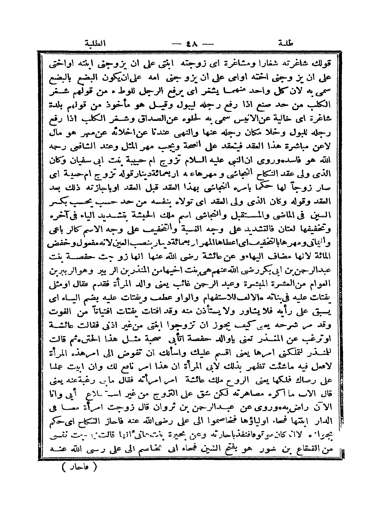 (ف وت) : وَعَنْ عَائِشَةَ - رَضِيَ اللَّهُ عَنْهَا - أَنَّهَا زَوَّجَتْ حَفْصَةَ بِنْتَ عَبْدِ الرَّحْمَنِ بْنِ أَبِي بَكْرٍ - رَضِيَ اللَّهُ عَنْهُمْ - هِيَ بِنْتُ أَخِيهَا مِنْ الْمُنْذِرِ بْنِ الزُّبَيْرِ وَهُوَ الزُّبَيْرُ بْنُ الْعَوَّامِ مِنْ الْعَشَرَةِ الْمُبَشَّرَةِ وَعَبْدُ الرَّحْمَنِ غَائِبٌ يَعْنِي وَالِدُ الْمَرْأَةِ فَقَدِمَ فَقَالَ أَوَمِثْلِي يُفْتَاتُ عَلَيْهِ فِي بَنَاتِهِ الْأَلِفُ لِلِاسْتِفْهَامِ وَالْوَاوُ عَطْفٌ وَيُفْتَاتُ عَلَيْهِ بِضَمِّ الْيَاءِ أَيْ يُسْبَقُ عَلَى رَأْيِهِ فَلَا يُشَاوَرُ وَلَا يُسْتَأْذَنُ مِنْهُ وَقَدْ افْتَاتَ يَفْتَاتُ افْتِيَاتًا مِنْ الْفَوْتِ وَقَدْ مَرَّ شَرْحُهُ يَعْنِي كَيْفَ يَجُوزُ أَنْ تُزَوِّجُوا ابْنَتِي مِنْ غَيْرِ إذْنِي فَقَالَتْ عَائِشَةُ أَوَتَرْغَبُ عَنْ الْمُنْذِرِ تَعْنِي يَا وَالِدَ حَفْصَةَ أَتَأْبَى صُحْبَةَ مِثْلِ هَذَا الْخَتَنِ ثُمَّ قَالَتْ لِلْمُنْذِرِ لَتُمَلِّكَنِّي أَمْرَهَا يَعْنِي أُقْسِمُ عَلَيْكَ وَأَسْأَلُكَ أَنْ تُفَوِّضَ إلَيَّ أَمْرَ هَذِهِ الْمَرْأَةِ لِأَفْعَلَ فِيهِ مَا شِئْتُ تُظْهِرُ بِذَلِكَ لِأَبِي الْمَرْأَةِ أَنَّ هَذَا أَمْرٌ نَافِعٌ لَكَ وَإِنْ أَبَيْتَ عَمِلْنَا عَلَى رِضَاكَ فَمَلَّكَهَا يَعْنِي الزَّوْجُ مَلَّكَ عَائِشَةَ أَمْرَ امْرَأَتِهِ فَقَالَ مَا بِي رَغْبَةٌ عَنْهُ يَعْنِي قَالَ الْأَبُ مَا أَكْرَهُ مُصَاهَرَتَهُ لَكِنْ شَقَّ عَلَيَّ التَّزَوُّجُ مِنْ غَيْرِ اسْتِطْلَاعِ رَأْيِي وَأَنَا الْآنَ رَاضٍ بِهِ وَرُوِيَ عَنْ عَبْدِ الرَّحْمَنِ بْنِ ثَرْوَانَ قَالَ زَوَّجَتْ امْرَأَةٌ مَعَنَا فِي الدَّارِ ابْنَتَهَا فَجَاءَ أَوْلِيَاؤُهَا فَخَاصَمُوا إلَى عَلِيٍّ - رَضِيَ اللَّهُ عَنْهُ - فَأَجَازَ النِّكَاحَ أَيْ حَكَمَ بِجَوَازِهِ لَا أَنَّهُ كَانَ مَوْقُوفًا فَنَفَذَ بِإِجَازَتِهِ وَعَنْ بَحِيرَةَ بِنْتِ هَانِئٍ أَنَّهَا قَالَتْ زَوَّجْتُ نَفْسِي مِنْ الْقَعْقَاعِ بْنِ شَوْرٍ هُوَ بِفَتْحِ الشِّينِ فَجَاءَ أَبِي فَخَاصَمَ إلَى عَلِيٍّ - رَضِيَ اللَّهُ عَنْهُ -