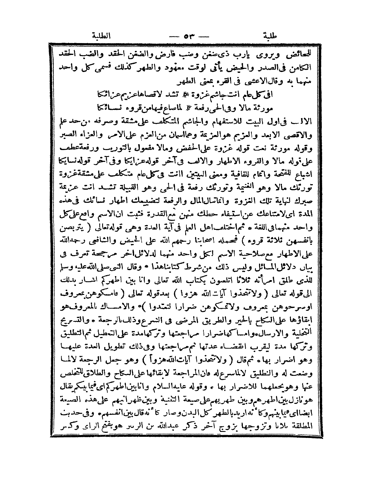 الْأَلِفُ فِي أَوَّلِ الْبَيْتِ لِلِاسْتِفْهَامِ وَالْجَاشِمُ الْمُتَكَلِّفُ عَلَى مَشَقَّةٍ وَصَرْفُهُ مِنْ حَدِّ عَلِمَ وَالْأَقْصَى الْأَبْعَدُ وَالْعَزِيمُ هُوَ الْعَزِيمَةُ وَهُمَا اسْمَانِ مِنْ الْعَزْمِ عَلَى الْأَمْرِ وَالْعَزَاءُ الصَّبْرُ وَقَوْلُهُ مُوَرِّثَةٍ نَعْتُ قَوْلِهِ غَزْوَةٍ عَلَى الْخَفْضِ وَمَالًا مَفْعُولٌ بِالتَّوْرِيثِ وَرِفْعَةً عَطْفٌ عَلَى قَوْلِهِ مَالًا وَالْقُرُوءُ الْأَطْهَارُ وَالْأَلِفُ فِي آخِرِ قَوْلِهِ عَزَائِكَا وَفِي آخِرِ قَوْلِهِ نِسَائِكَا إشْبَاعٌ لِلْفَتْحَةِ وَإِتْمَامٌ لِلْقَافِيَةِ وَمَعْنَى الْبَيْتَيْنِ أَنْتَ فِي كُلِّ عَامٍ مُتَكَلِّفٌ عَلَى مَشَقَّةٍ غَزْوَةً تُوَرِّثُكَ مَالًا وَهُوَ الْغَنِيمَةُ وَتُورِثُكَ رِفْعَةً فِي الْحَيِّ وَهُوَ الْقَبِيلَةُ تَشُدُّ أَنْتَ عَزِيمَةَ صَبْرِك لِنِهَايَةِ تِلْكَ الْغَزْوَةِ وَإِنَّمَا تَنَالُ الْمَالَ وَالرِّفْعَةَ لِتَضْيِيعِكَ أَطْهَارَ نِسَائِكَ فِي هَذِهِ الْمُدَّةِ أَيْ لِامْتِنَاعِكَ عَنْ اسْتِيفَاءِ حَظِّكَ مِنْهُنَّ مَعَ الْقُدْرَةِ فَثَبَتَ أَنَّ الِاسْمَ وَاقِعٌ عَلَى كُلِّ وَاحِدٍ مِنْهُمَا فِي اللُّغَةِ ثُمَّ اخْتَلَفَ أَهْلُ الْعِلْمِ فِي آيَةِ الْعِدَّةِ وَهِيَ قَوْله تَعَالَى {يَتَرَبَّصْنَ بِأَنْفُسِهِنَّ ثَلَاثَةَ قُرُوءٍ} [البقرة: 228] فَحَمَلَهُ أَصْحَابُنَا رَحِمَهُمْ اللَّهُ عَلَى الْحَيْضِ وَالشَّافِعِيُّ رَحِمَهُ اللَّهُ عَلَى الْأَطْهَارِ مَعَ صَلَاحِيَّةِ الِاسْمِ لِكُلِّ وَاحِدٍ مِنْهُمَا لِدَلَائِلَ أُخَرَ مُرَجِّحَةٍ تُعْرَفُ فِي بَيَانِ دَلَائِلِ الْمَسَائِلِ وَلَيْسَ ذَلِكَ مِنْ شَرْطِ كِتَابِنَا هَذَا.