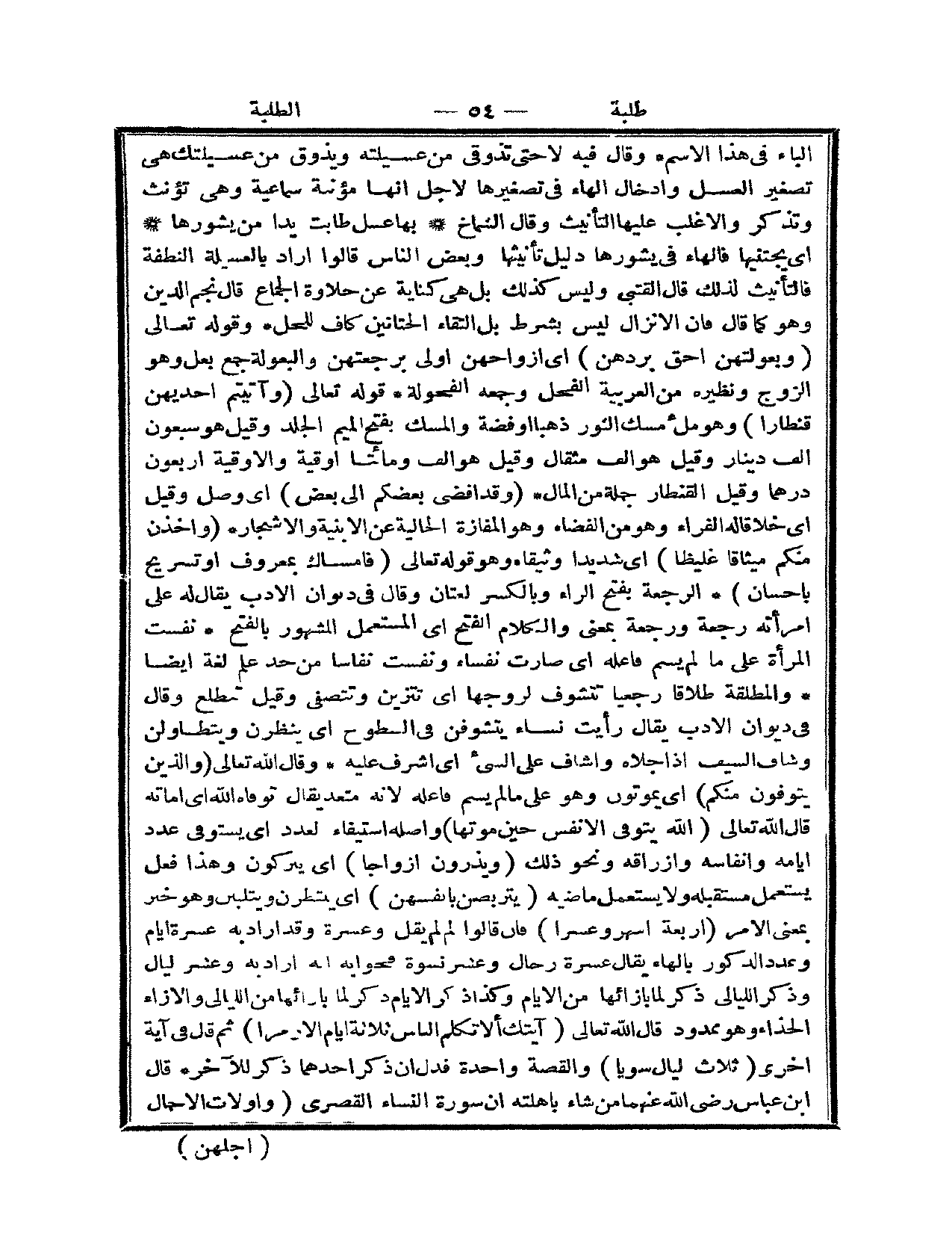 (ب هـ ل) : {أَرْبَعَةَ أَشْهُرٍ وَعَشْرًا} [البقرة: 234] فَإِنْ قَالُوا لِمَ لَمْ يَقُلْ وَعَشَرَةً وَقَدْ أَرَادَ بِهِ عَشَرَةَ أَيَّامٍ وَعَدَّدَ الذُّكُورَ بِالْهَاءِ يُقَالُ عَشَرَةُ رِجَالٍ وَعَشْرُ نِسْوَةٍ فَجَوَابُهُ أَنَّهُ أَرَادَ بِهِ عَشْرَ لَيَالٍ وَذِكْرُ اللَّيَالِي ذِكْرٌ لِمَا بِإِزَائِهَا مِنْ الْأَيَّامِ وَكَذَا ذِكْرُ الْأَيَّامِ ذِكْرٌ لِمَا بِإِزَائِهَا مِنْ اللَّيَالِي وَالْإِزَاءُ الْحِذَاءُ وَهُوَ مَمْدُودٌ قَالَ اللَّهُ تَعَالَى {آيَتُكَ أَلَّا تُكَلِّمَ النَّاسَ ثَلَاثَةَ أَيَّامٍ إلَّا رَمْزًا} [آل عمران: 41] ثُمَّ قَالَ فِي آيَةٍ أُخْرَى {ثَلَاثَ لَيَالٍ سَوِيًّا} [مريم: 10] وَالْقِصَّةُ وَاحِدَةٌ فَدَلَّ أَنَّ ذِكْرَ أَحَدِهِمَا ذِكْرٌ لِلْآخَرِ قَالَ ابْنُ عَبَّاسٍ - رَضِيَ اللَّهُ عَنْهُمَا - مَنْ شَاءَ بَاهَلْتُهُ أَنَّ سُورَةَ النِّسَاءِ الْقُصْرَى