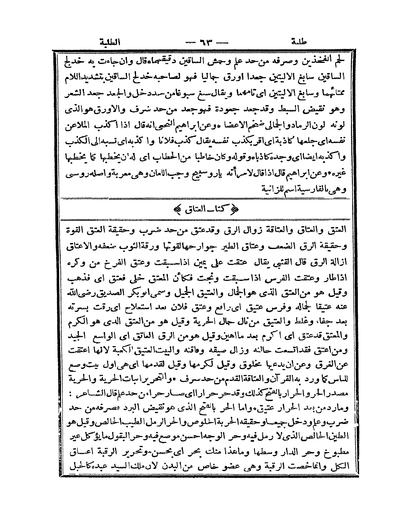 (ع ت ق) : الْعِتْقُ وَالْعَتَاقُ وَالْعَتَاقَةُ زَوَالُ الرِّقِّ وَقَدْ عَتَقَ مِنْ حَدِّ ضَرَبَ وَحَقِيقَةُ الْعِتْقِ الْقُوَّةُ وَحَقِيقَةُ الرِّقِّ الضَّعْفُ وَعِتَاقُ الطَّيْرِ جَوَارِحُهَا لِقُوَّتِهَا وَرِقَّةُ الثَّوْبِ ضَعْفُهُ وَالْإِعْتَاقُ إزَالَةُ الرِّقِّ قَالَ الْقُتَبِيُّ يُقَالُ عَتَقْتُ عَلَى يَمِينٍ إذَا سَبَقْتُ وَعَتَقَ الْفَرْخُ مِنْ وَكْرِهِ إذَا طَارَ وَعَتَقَتْ الْفَرَسُ إذَا سَبَقَتْ وَنَجَتْ فَكَأَنَّ الْمُعْتَقَ خُلِّيَ فَعَتَقَ أَيْ فَذَهَبَ وَقِيلَ هُوَ مِنْ الْعِتْقِ الَّذِي هُوَ الْجَمَالُ وَالْعَتِيقُ الْجَمِيلُ وَسُمِّيَ أَبُو بَكْرٍ الصِّدِّيقُ - رَضِيَ اللَّهُ عَنْهُ - عَتِيقًا لِجَمَالِهِ وَفَرَسٌ عَتِيقٌ أَيْ رَافِعٌ وَعَتَقَ فُلَانٌ بَعْدَ اسْتِعْلَاجٍ أَيْ رَقَّتْ بَشَرَتُهُ بَعْدَ جَفَاءٍ وَغِلَظٍ وَالْعَتِيقُ مَنْ نَالَ جَمَالَ الْحُرِّيَّةِ وَقِيلَ هُوَ مِنْ الْعِتْقِ الَّذِي هُوَ الْكَرَمُ وَالْمُعْتَقُ قَدْ عَتَقَ أَيْ أُكْرِمَ بَعْدَ مَا أُهِينَ وَقِيلَ هُوَ مِنْ الزِّقِّ الْعَاتِقِ أَيْ الْوَاسِعِ الْجَيِّدِ وَمَنْ أُعْتِقَ فَقَدْ اتَّسَعَتْ حَالَتُهُ وَزَالَ ضِيقُهُ وَفَاقَتُهُ وَالْبَيْتُ الْعَتِيقُ الْكَعْبَةُ لِأَنَّهَا أُعْتِقَتْ عَنْ الْغَرَقِ وَعَنْ أَنْ يَدَّعِيَهَا مَخْلُوقٌ وَقِيلَ لِكَرَمِهَا وَقِيلَ لِقِدَمِهَا أَيْ هِيَ أَوَّلُ بَيْتٍ وُضِعَ لِلنَّاسِ كَمَا وَرَدَ بِهِ الْقُرْآنُ وَالْعَتَاقَةُ الْقِدَمُ مِنْ حَدِّ شَرُفَ.