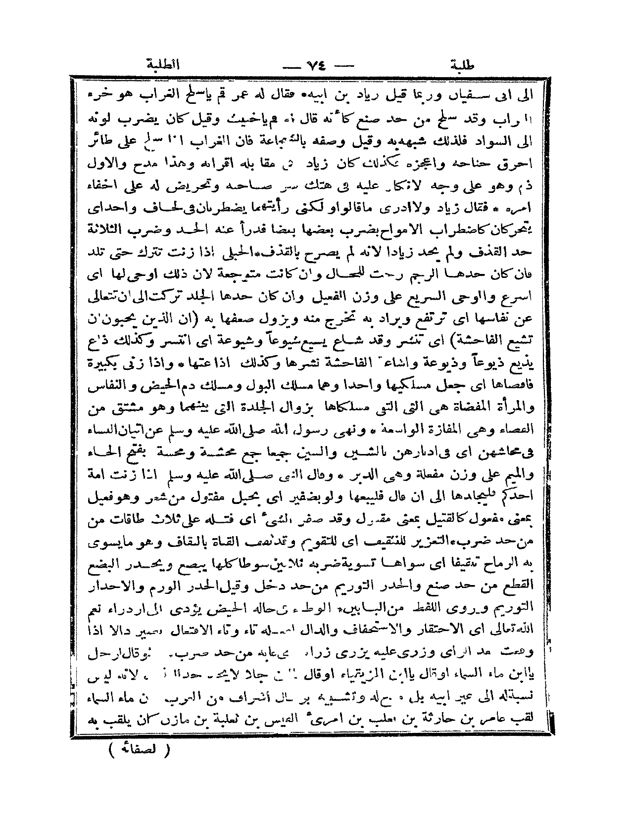 إلَى أَبِي سُفْيَانَ وَرُبَّمَا قِيلَ زِيَادُ ابْنُ أَبِيهِ فَقَالَ لَهُ عُمَرُ قُمْ يَا سَلْحَ الْغُرَابِ هُوَ خُرْءُ الْغُرَابِ وَقَدْ سَلَحَ مِنْ حَدِّ صَنَعَ كَأَنَّهُ قَالَ لَهُ قُمْ يَا خَبِيثُ وَقِيلَ كَانَ يَضْرِبُ لَوْنُهُ إلَى السَّوَادِ فَلِذَلِكَ شَبَّهَهُ بِهِ وَقِيلَ وَصَفَهُ بِالشَّجَاعَةِ فَإِنَّ الْغُرَابَ إذَا سَلَحَ عَلَى طَائِرٍ أَحْرَقَ جَنَاحَهُ وَأَعْجَزَهُ فَكَذَلِكَ كَانَ زِيَادٌ فِي مُقَابَلَةِ أَقْرَانِهِ وَهَذَا مَدْحٌ وَالْأَوَّلُ ذَمٌّ وَهُوَ عَلَى وَجْهِ الْإِنْكَارِ عَلَيْهِ فِي هَتْكِ سِرِّ صَاحِبِهِ وَتَحْرِيضٌ لَهُ عَلَى إخْفَاءِ أَمْرِهِ فَقَالَ زِيَادٌ وَلَا أَدْرِي مَا قَالُوا وَلَكِنِّي رَأَيْتُهُمَا يَضْطَرِبَانِ فِي لِحَافٍ وَاحِدٍ أَيْ يَتَحَرَّكَانِ كَاضْطِرَابِ الْأَمْوَاجِ يَضْرِبُ بَعْضُهَا بَعْضًا فَدَرَأَ عَنْهُ الْحَدَّ وَضَرَبَ الثَّلَاثَةَ حَدَّ الْقَذْفِ وَلَمْ يَحِدَّ زِيَادًا لِأَنَّهُ لَمْ يُصَرِّحْ بِالْقَذْفِ.