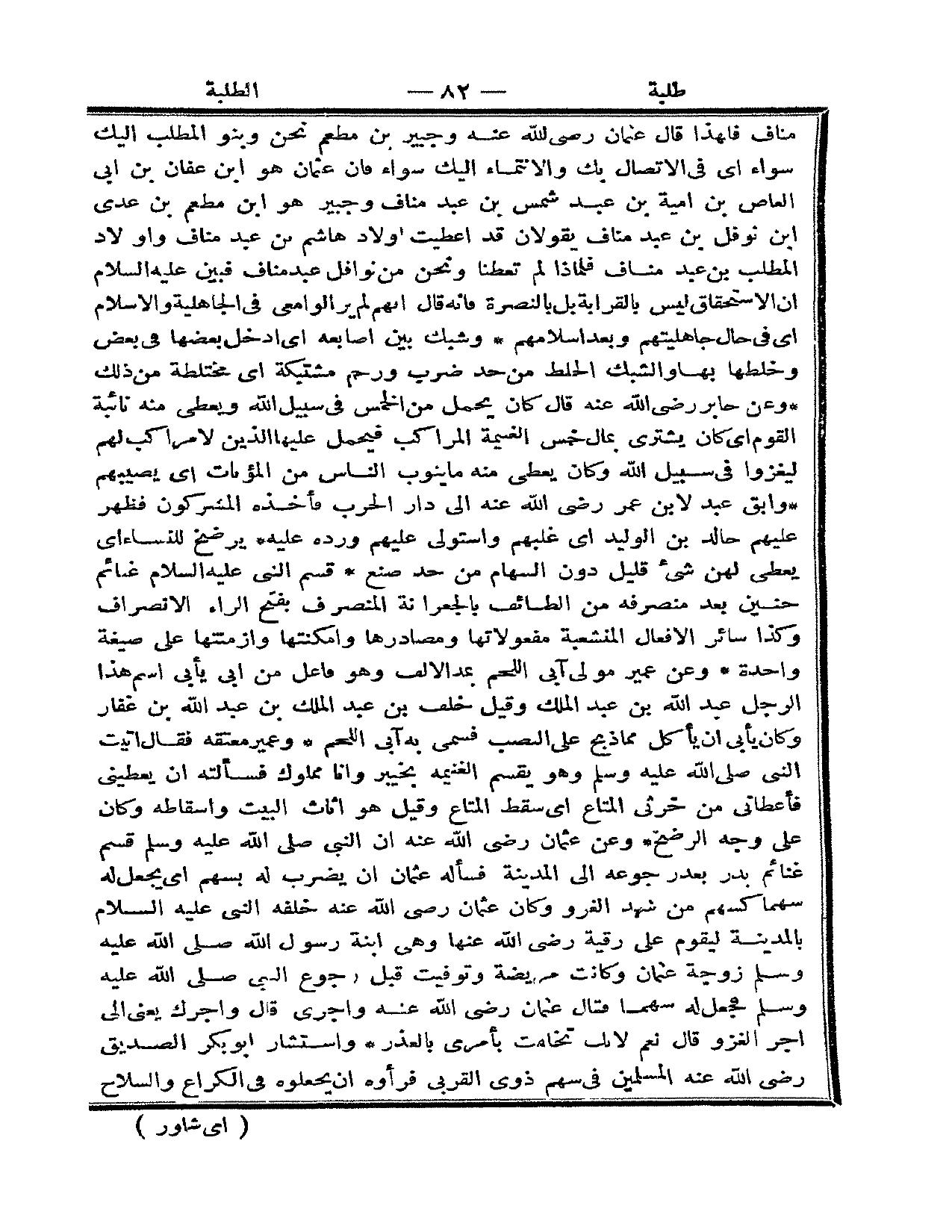 فَلِهَذَا قَالَ عُثْمَانُ - رَضِيَ اللَّهُ عَنْهُ - وَجُبَيْرُ بْنُ مُطْعِمٍ نَحْنُ وَبَنُو الْمُطَّلِبِ إلَيْكَ سَوَاءٌ أَيْ فِي الِاتِّصَالِ بِكَ وَالِانْتِمَاءِ إلَيْكَ سَوَاءٌ فَإِنَّ عُثْمَانَ هُوَ ابْنُ عَفَّانَ بْنُ أَبِي الْعَاصِ بْنِ أُمَيَّةَ بْنِ عَبْدِ شَمْسِ بْنِ عَبْدِ مَنَافٍ وَجُبَيْرٌ هُوَ ابْنُ مُطْعِمِ بْنِ عَدِيِّ بْنِ نَوْفَلِ بْنِ عَبْدِ مَنَافٍ يَقُولَانِ قَدْ أَعْطَيْتَ أَوْلَادَ هَاشِمِ بْنِ عَبْدِ مَنَافٍ وَأَوْلَادَ الْمُطَّلِبِ بْنِ عَبْدِ مَنَافٍ فَلِمَاذَا لَمْ تُعْطِنَا وَنَحْنُ مِنْ نَوَافِلِ عَبْدِ مَنَافٍ فَبَيَّنَ - عَلَيْهِ السَّلَامُ - أَنَّ الِاسْتِحْقَاقَ لَيْسَ بِالْقَرَابَةِ بَلْ بِالنُّصْرَةِ فَإِنَّهُ قَالَ إنَّهُمْ لَمْ يَزَالُوا مَعِي فِي الْجَاهِلِيَّةِ وَالْإِسْلَامِ أَيْ فِي حَالِ جَاهِلِيَّتِهِمْ وَبَعْدَ إسْلَامِهِمْ وَشَبَّكَ بَيْنَ أَصَابِعِهِ أَيْ أَدْخَلَ بَعْضَهَا فِي بَعْضٍ وَخَلَطَهَا بِهَا وَالشَّبْكُ الْخَلْطُ مِنْ حَدِّ ضَرَبَ وَرَحِمٌ مُشْتَبِكَةٌ أَيْ مُخْتَلِطَةٌ مِنْ ذَلِكَ وَعَنْ جَابِرٍ - رَضِيَ اللَّهُ عَنْهُ - قَالَ كَانَ يَحْمِلُ مِنْ الْخُمُسِ فِي سَبِيلِ اللَّهِ وَيُعْطِي مِنْهُ نَائِبَةَ الْقَوْمِ أَيْ كَانَ يَشْتَرِي بِمَالِ خُمُسِ الْغَنِيمَةِ الْمَرَاكِبَ فَيَحْمِلُ عَلَيْهَا الَّذِينَ لَا مَرَاكِبَ لَهُمْ لِيَغْزُوا فِي سَبِيلِ اللَّهِ وَكَانَ يُعْطِي مِنْهُ مَا يَنُوبُ النَّاسَ مِنْ الْمُؤْنَاتِ أَيْ يُصِيبُهُمْ.