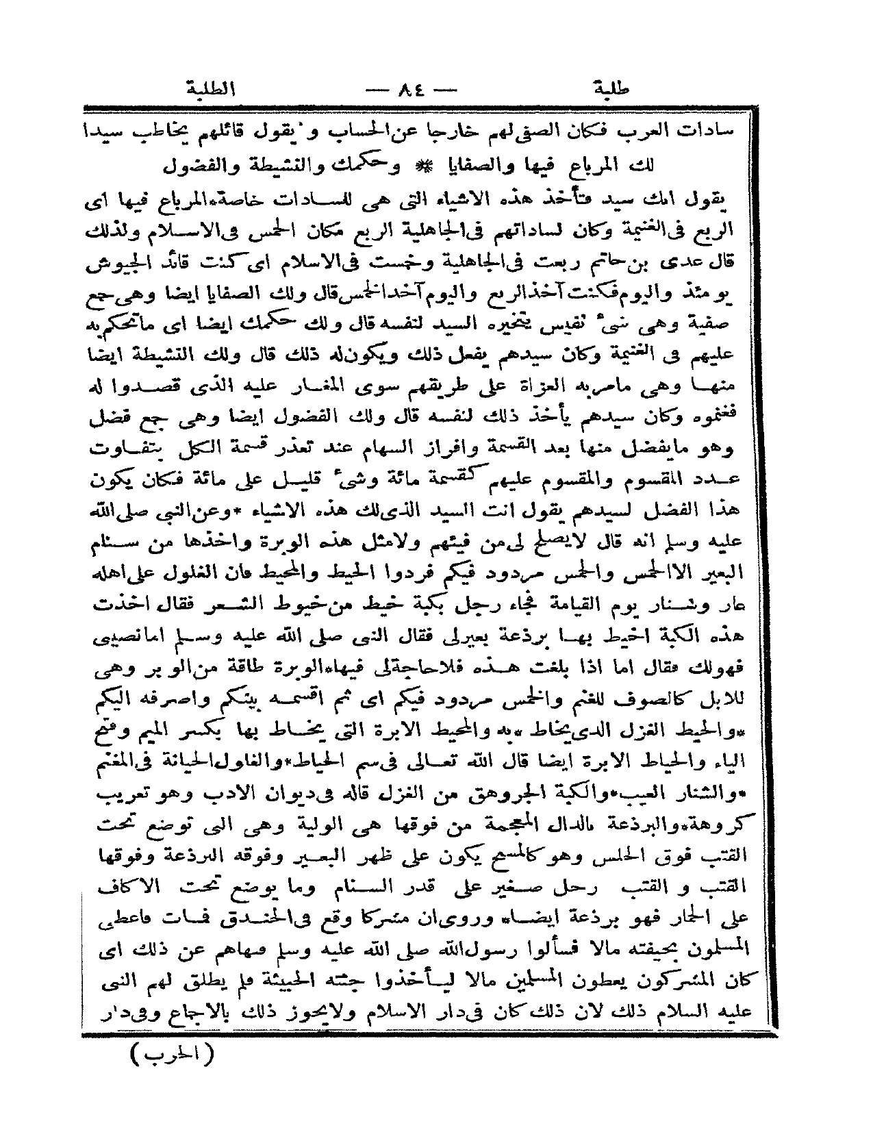 يَقُولُ إنَّكَ سَيِّدٌ فَتَأْخُذُ هَذِهِ الْأَشْيَاءَ الَّتِي هِيَ لِلسَّادَاتِ خَاصَّةً الْمِرْبَاعُ فِيهَا أَيْ الرُّبْعُ فِي الْغَنِيمَةِ وَكَانَ لِسَادَاتِهِمْ فِي الْجَاهِلِيَّةِ الرُّبُعُ مَكَانَ الْخُمُسِ فِي الْإِسْلَامِ وَلِذَلِكَ قَالَ عَدِيُّ بْنُ حَاتِمٍ رَبَعْتُ فِي الْجَاهِلِيَّةِ وَخَمَسْتُ فِي الْإِسْلَامِ أَيْ كُنْت قَائِدَ الْجُيُوشِ يَوْمئِذٍ وَالْيَوْمَ فَكُنْت آخُذُ الرُّبُعَ وَالْيَوْمَ آخُذُ الْخُمُسَ قَالَ وَلَك الصَّفَايَا أَيْضًا وَهِيَ جَمْعُ صَفِيَّةٍ وَهِيَ شَيْءٌ نَفِيسٌ يَتَخَيَّرُهُ السَّيِّدُ لِنَفْسِهِ قَالَ وَلَك حُكْمُك أَيْضًا أَيْ مَا تَحْكُمُ بِهِ عَلَيْهِمْ فِي الْغَنِيمَةِ وَكَانَ سَيِّدُهُمْ يَفْعَلُ ذَلِكَ وَيَكُونُ لَهُ ذَلِكَ قَالَ وَلَك النَّشِيطَةُ أَيْضًا مِنْهَا وَهِيَ مَا مَرَّ بِهِ الْغُزَاةُ عَلَى طَرِيقِهِمْ سِوَى الْمُغَارِ عَلَيْهِ الَّذِي قَصَدُوا لَهُ فَغَنِمُوهُ وَكَانَ سَيِّدُهُمْ يَأْخُذُ ذَلِكَ لِنَفْسِهِ قَالَ وَلَك الْفُضُولُ أَيْضًا وَهِيَ جَمْعُ فَضْلٍ وَهُوَ مَا يَفْضُلُ مِنْهَا بَعْدَ الْقِسْمَةِ وَإِفْرَازِ السِّهَامِ عِنْدَ تَعَذُّرِ قِسْمَةِ الْكُلِّ بِتَفَاوُتِ عَدَدِ الْمَقْسُومِ وَالْمَقْسُومِ عَلَيْهِمْ كَقِسْمَةِ مِائَةٍ وَشَيْءٍ قَلِيلٍ عَلَى مِائَةٍ فَكَانَ يَكُونُ هَذَا الْفَضْلُ لِسَيِّدِهِمْ يَقُولُ أَنْتَ السَّيِّدُ الَّذِي لَك هَذِهِ الْأَشْيَاءُ.