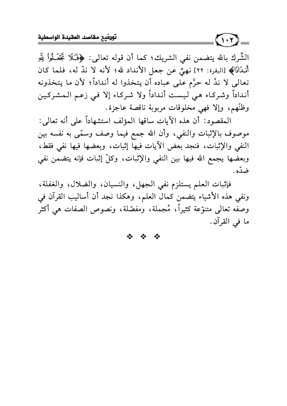المقصود إن هذه الآيات ساقها المؤلف استشهادا على أنه تعالى: موصوف بالإثبات، والنفي، وأن الله جمع فيما وصف، وسمى به نفسه بين النفي، والإثبات، فنجد بعض الآيات فيها إثبات، وبعضها فيها نفي فقط، وبعضها يجمع الله فيها بين النفي، والإثبات، وكل إثبات فإنه يتضمن نفي ضده.