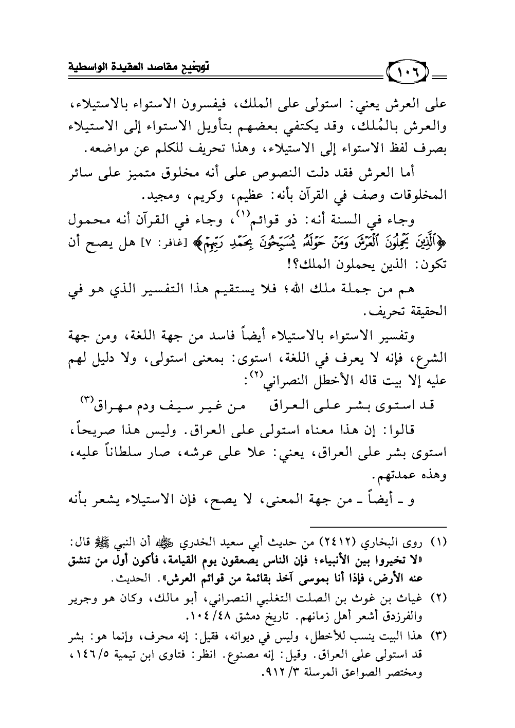 (¬3) [هذا البيت ينسب للأخطل، وليس في ديوانه، فقيل: إنه محرف، وإنما هو: بشر قد استولى على العراق. وقيل: إنه مصنوع. انظر: فتاوى ابن تيمية 5/ 146، ومختصر الصواعق المرسلة 3/ 912]