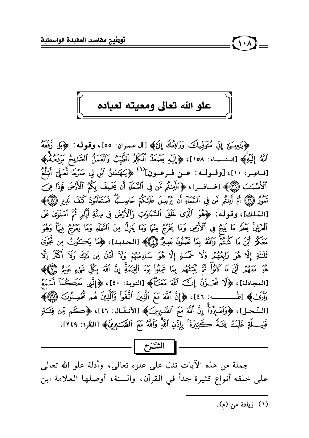 {يَا عِيسَى إِنِّي مُتَوَفِّيكَ وَرَافِعُكَ إِلَيَّ} [(55) سورة آل عمران] وقوله {بَل رَّفَعَهُ اللهُ إِلَيْهِ} [(158) سورة النساء] {إِلَيْهِ يَصْعَدُ الْكَلِمُ الطَّيِّبُ وَالْعَمَلُ الصَّالِحُ يَرْفَعُهُ} [(10) سورة فاطر] [وقوله عن فرعون] (¬1) {يَا هَامَانُ ابْنِ لِي صَرْحًا لَّعَلِّي أَبْلُغُ الْأَسْبَابَ * أَسْبَابَ السَّمَاوَاتِ فَأَطَّلِعَ إِلَى إِلَهِ مُوسَى وَإِنِّي لَأَظُنُّهُ كَاذِبًا} [(36 - 37) سورة غافر] {أَأَمِنتُم مَّن فِي السَّمَاء أَن يَخْسِفَ بِكُمُ الأَرْضَ فَإِذَا هِيَ تَمُورُ * أَمْ أَمِنْتُمْ مَنْ فِي السَّمَاءِ أَنْ يُرْسِلَ عَلَيْكُمْ حَاصِبًا فَسَتَعْلَمُونَ كَيْفَ نَذِيرِ} [(16 - 17) سورة الملك] وقوله {هُوَ الَّذِي خَلَقَ السَّمَاوَاتِ وَالْأَرْضَ فِي سِتَّةِ أَيَّامٍ ثُمَّ اسْتَوَى عَلَى الْعَرْشِ يَعْلَمُ مَا يَلِجُ فِي الْأَرْضِ وَمَا يَخْرُجُ مِنْهَا وَمَا يَنزِلُ مِنَ السَّمَاء وَمَا يَعْرُجُ فِيهَا وَهُوَ مَعَكُمْ أَيْنَ مَا كُنتُمْ وَاللَّهُ بِمَا تَعْمَلُونَ بَصِيرٌ} [(4) سورة الحديد] {مَا يَكُونُ مِن نَّجْوَى ثَلَاثَةٍ إِلَّا هُوَ رَابِعُهُمْ وَلَا خَمْسَةٍ إِلَّا هُوَ سَادِسُهُمْ وَلَا أَدْنَى مِن ذَلِكَ وَلَا أَكْثَرَ إِلَّا هُوَ مَعَهُمْ أَيْنَ مَا كَانُوا ثُمَّ يُنَبِّئُهُم بِمَا عَمِلُوا يَوْمَ الْقِيَامَةِ إِنَّ اللَّهَ بِكُلِّ شَيْءٍ عَلِيمٌ} [(7) سورة المجادلة] {لاَ تَحْزَنْ إِنَّ اللهَ مَعَنَا} [(40) سورة التوبة] {إِنَّنِي مَعَكُمَا أَسْمَعُ وَأَرَى} [(46) سورة طه] {إِنَّ اللهَ مَعَ الَّذِينَ اتَّقَوا وَّالَّذِينَ هُم مُّحْسِنُونَ} [(128) سورة النحل] {وَاصْبِرُوا إِنَّ اللهَ مَعَ الصَّابِرِينَ} [(46) سورة الأنفال] {كَم مِّن فِئَةٍ قَلِيلَةٍ غَلَبَتْ فِئَةً كَثِيرَةً بِإِذْنِ اللهِ وَاللهُ مَعَ الصَّابِرِينَ} [(249) سورة البقرة].