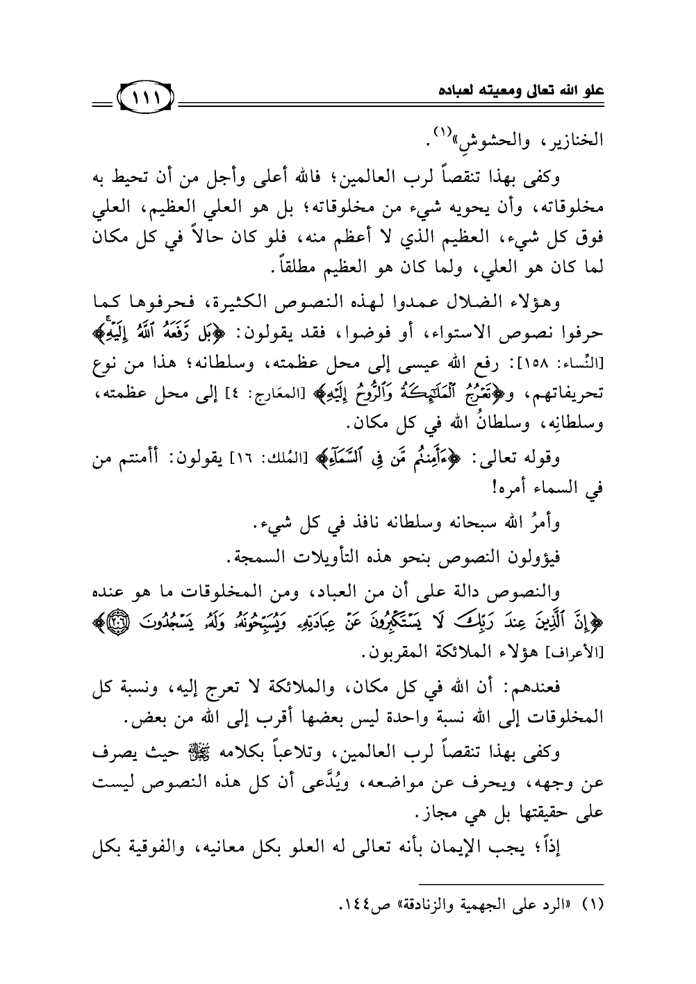 وكفى بهذا تنقصا لرب العالمين، فالله أعلى، وأجل من أن تحيط به مخلوقاته، وأن يحويه شيء من مخلوقاته، بل هو العلي العظيم، العلي فوق كل شيء، العظيم الذي لا أعظم منه، فلو كان حالا في كل مكان لما كان هو العلي، ولما كان هو العظيم مطلقا.