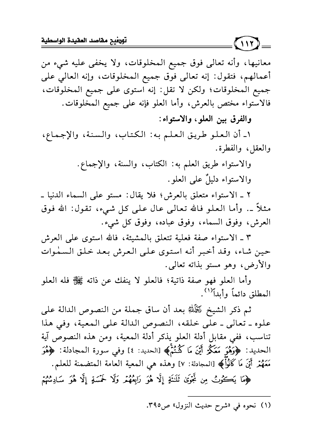 ثم ذكر الشيخ رحمه الله ـ بعد أن ساق جملة من النصوص الدالة على علوه -تعالى- على خلقه ـ النصوص الدالة على المعية، وفي هذا تناسب، ففي مقابل أدلة العلو يذكر أدلة المعية، ومن هذه النصوص آية الحديد {وَهُوَ مَعَكُمْ أَيْنَ مَا كُنْتُمْ} وفي سورة المجادلة {هُوَ مَعَهُمْ أَيْنَ مَا كَانُوا} وهذه هي المعية العامة المتضمنة للعلم.