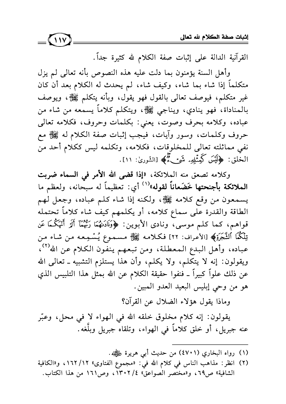 وكلامه تصعق منه الملائكة، " إذا قضى الله الأمر في السماء ضربت الملائكة بأجنحتها خَضَعانا لقوله" (¬1) أي: تعظيما له سبحانه، ولعظم ما يسمعون من وقع كلامه سبحانه وتعالى، ولكنه إذا شاء كلم عباده، وجعل لهم الطاقة والقدرة على سماع كلامه، أو يكلمهم كيف شاء كلاما تحتمله قواهم، كما كلم موسى، ونادى الأبوين {وَنَادَاهُمَا رَبُّهُمَا أَلَمْ أَنْهَكُمَا عَنْ تِلْكُمَا الشَّجَرَةِ} فكلامه سبحانه وتعالى كلام مسموع يُسْمِعه من شاء من عباده، وأهل البدع المعطلة، ومن تبعهم ينفون الكلام عن الله (¬2)، ويقولون: إنه لا يتكلم، ولا يكلم، وأن هذا يستلزم التشبيه، تعالى الله عن ذلك علوا كبيرا، فنفوا حقيقة الكلام عن الله بمثل هذا التلبيس الذي هو من وحي إبليس البعيد العدو المبين.