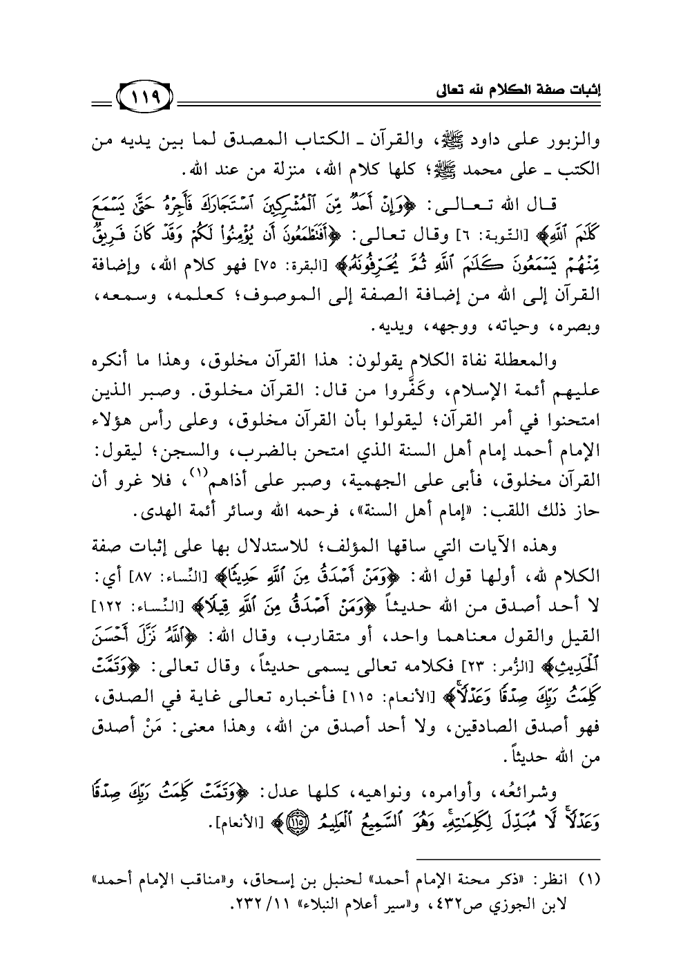 والمعطلة نفاة الكلام يقولون: هذا القرآن مخلوق، وهذا ما أنكره عليهم أئمة الإسلام، وكَفَّروا من قال: القرآن مخلوق. وصبر الذين امتحنوا في أمر القرآن؛ ليقولوا بأن القرآن مخلوق، وعلى رأس هؤلاء الإمام أحمد إمام أهل السنة الذي امتحن بالضرب، والسجن؛ ليقول القرآن مخلوق، فأبى على الجهمية، وصبر على أذاهم، فلا غرو أن حاز ذلك اللقب "إمام أهل السنة"، فرحمه الله وسائر أئمة الهدى (¬1).