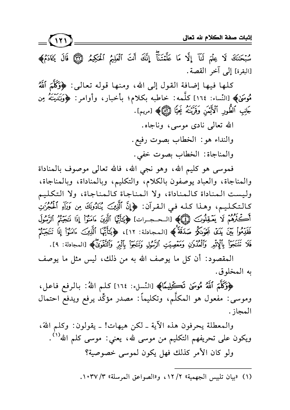 فموسى هو كليم الله، وهو نجي الله، فالله تعالى موصوف بالمناداة والمناجاة، والعباد يوصفون بالكلام، والتكليم، وبالمناداة وبالمناجاة، وليست المناداة كالمناداة، ولا المناجاة كالمناجاة، ولا التكليم كالتكليم، وهذا كله في القرآن {إِنَّ الَّذِينَ يُنَادُونَكَ مِن وَرَاء الْحُجُرَاتِ أَكْثَرُهُمْ لَا يَعْقِلُونَ} [(4) سورة الحجرات] {يَا أَيُّهَا الَّذِينَ آمَنُوا إِذَا نَاجَيْتُمُ الرَّسُولَ فَقَدِّمُوا بَيْنَ يَدَيْ نَجْوَاكُمْ صَدَقَةً} [(12) سورة المجادلة] {يَا أَيُّهَا الَّذِينَ آمَنُوا إِذَا تَنَاجَيْتُمْ فَلَا تَتَنَاجَوْا بِالْإِثْمِ وَالْعُدْوَانِ وَمَعْصِيَتِ الرَّسُولِ وَتَنَاجَوْا بِالْبِرِّ وَالتَّقْوَى} [(9) سورة المجادلة].