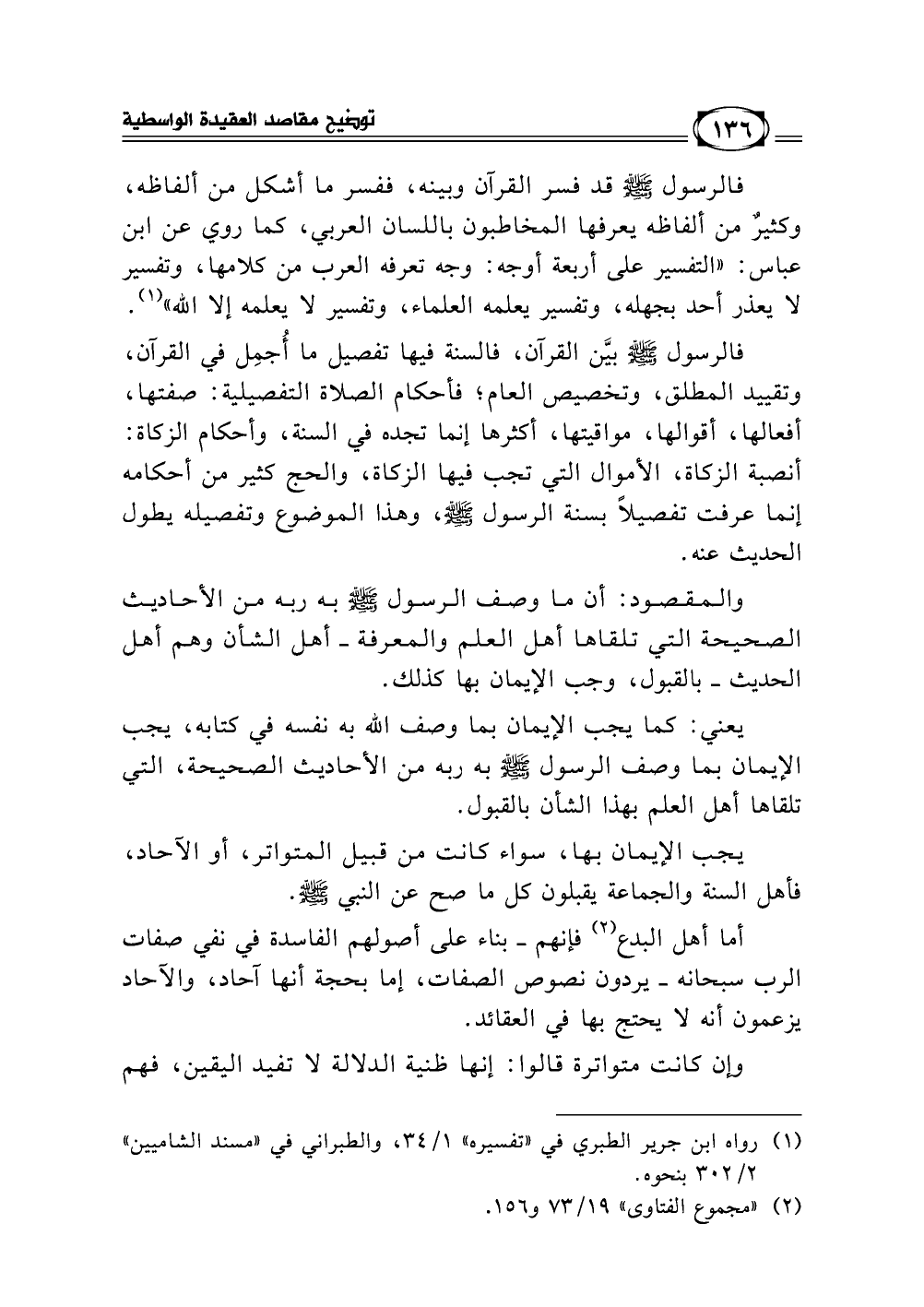 والمقصود أن ما وصف الرسول - صلى الله عليه وسلم - به ربه من الأحاديث الصحيحة التي تلقاها أهل العلم والمعرفة - أهل الشأن وهم أهل الحديث - بالقبول، وجب الإيمان بها كذلك.