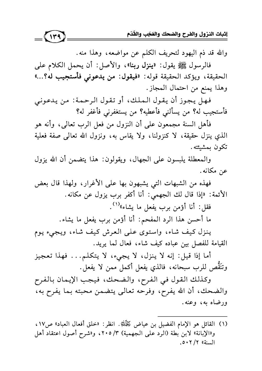 وكذلك القول في الفرح، والضحك، فيجب الإيمان بالفرح والضحك، أن الله يفرح، وفرحه تعالى يتضمن محبته بما يفرح به، ورضاه به، وعنه.