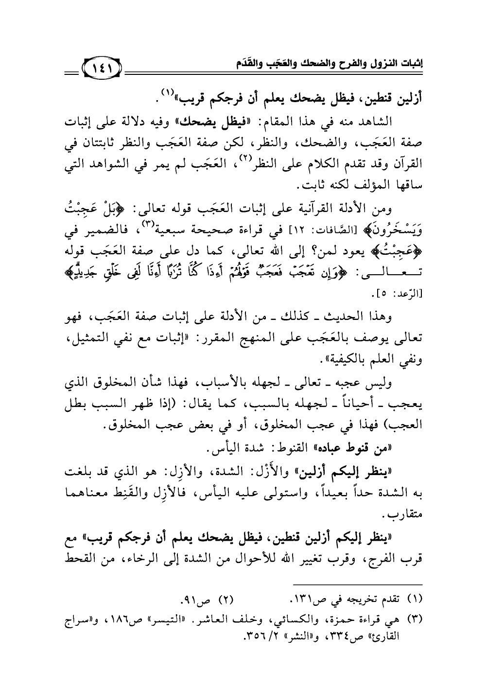 الشاهد منه في هذا المقام: "فيظل يضحك" وفيه دلالة على إثبات صفة العَجَب والضحك والنظر، لكن صفة العَجَب والنظر ثابتتان في القرآن وقد تقدم الكلام على النظر (¬2)، وإن كان العَجَب لم يمر في الشواهد التي ساقها المؤلف لكنه ثابت.