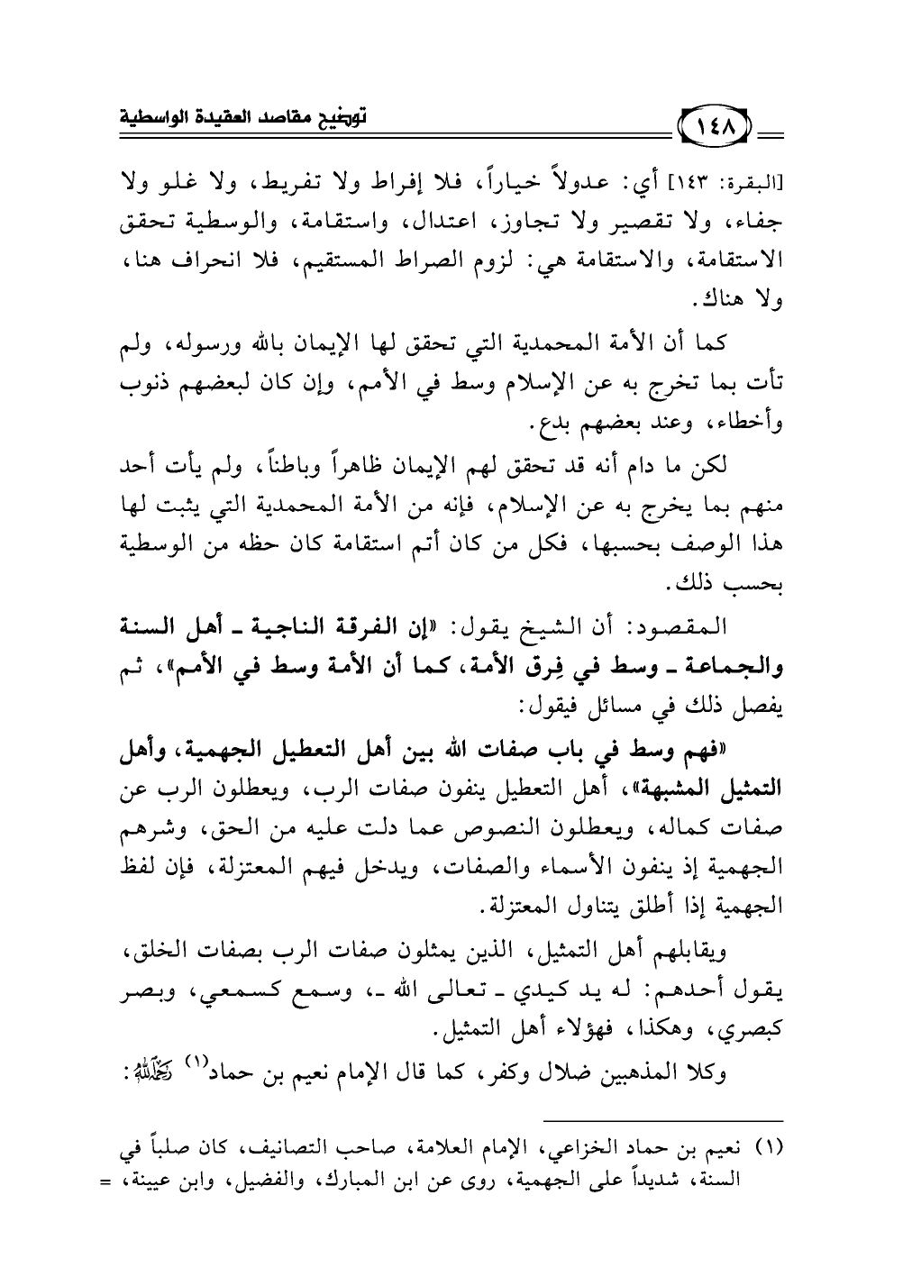 فهم وسط في باب صفات الله بين أهل التعطيل الجهمية، وأهل التمثيل المشبهة، أهل التعطيل ينفون صفات الرب، ويعطلون الرب عن صفات كماله، ويعطلون النصوص عما دلت عليه من الحق، وشرهم الجهمية إذ ينفون الأسماء والصفات، ويدخل فيهم المعتزلة، فإن لفظ الجهمية إذا أطلق يتناول المعتزلة.