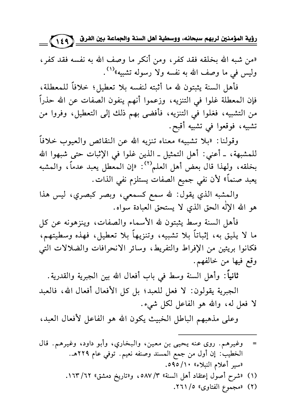 وقولنا: "بلا تشبيه " معناه تنزيه الله عن النقائص والعيوب خلافا للمشبهة، ـ أعني: أهل التمثيل ـ الذين غلوا في الإثبات حتى شبهوا الله بخلقه، ولهذا قال بعض أهل العلم (¬2): "إن المعطل يعبد عدما والمشبه يعبد صنما " لأن نفي جميع الصفات يستلزم نفي الذات.