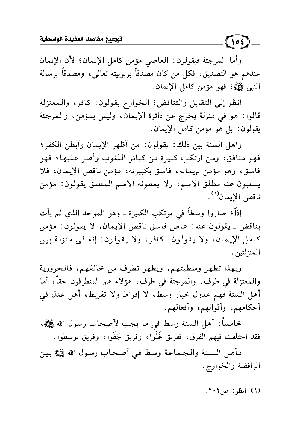 وأهل السنة بين ذلك، يقولون: من أظهر الإيمان وأبطن الكفر؛ فهو منافق، ومن ارتكب كبيرة من كبائر الذنوب وأصر عليها؛ فهو فاسق، وهو مؤمن بإيمانه، فاسق بكبيرته، مؤمن ناقص الإيمان، فلا يسلبون عنه مطلق الاسم، ولا يعطونه الاسم المطلق يقولون مؤمن ناقص الإيمان (¬1).