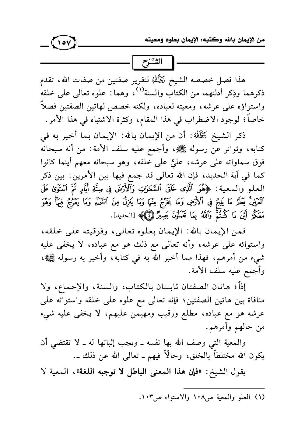 ذكر الشيخ ـ رحمه الله ـ: أن من الإيمان بالله: الإيمان بما أخبر به في كتابه، وتواتر عن رسوله - صلى الله عليه وسلم -، وأجمع عليه سلف الأمة: من أنه سبحانه فوق سماواته على عرشه، عليٌّ على خلقه، وهو سبحانه معهم أينما كانوا كما في آية الحديد، فإن الله تعالى قد جمع فيها بين الأمرين: بين ذكر العلو والمعية {هُوَ الَّذِي خَلَقَ السَّمَاوَاتِ وَالْأَرْضَ فِي سِتَّةِ أَيَّامٍ ثُمَّ اسْتَوَى عَلَى الْعَرْشِ يَعْلَمُ مَا يَلِجُ فِي الْأَرْضِ وَمَا يَخْرُجُ مِنْهَا وَمَا يَنزِلُ مِنَ السَّمَاء وَمَا يَعْرُجُ فِيهَا وَهُوَ مَعَكُمْ أَيْنَ مَا كُنتُمْ وَاللَّهُ بِمَا تَعْمَلُونَ بَصِيرٌ} [(4) سورة الحديد].