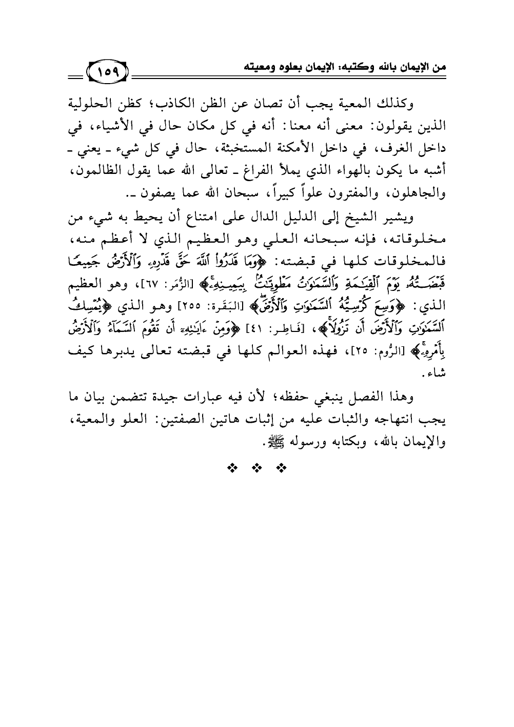 ويشير الشيخ إلى الدليل الدال على امتناع أن يحيط به شيء من مخلوقاته، فإنه سبحانه العلي وهو العظيم الذي لا أعظم منه، فالمخلوقات كلها في قبضته {وَمَا قَدَرُوا اللَّهَ حَقَّ قَدْرِهِ وَالْأَرْضُ جَمِيعًا قَبْضَتُهُ يَوْمَ الْقِيَامَةِ وَالسَّماوَاتُ مَطْوِيَّاتٌ بِيَمِينِهِ} [(67) سورة الزمر]، وهو العظيم الذي {وَسِعَ كُرْسِيُّهُ السَّمَاوَاتِ وَالأَرْضَ} [(255) سورة البقرة] وهو الذي {يُمْسِكُ السَّمَاوَاتِ وَالْأَرْضَ أَن تَزُولَا} [(41) سورة فاطر] {وَمِنْ آيَاتِهِ أَن تَقُومَ السَّمَاء وَالْأَرْضُ بِأَمْرِهِ} [(25) سورة الروم]، فهذه العوالم كلها في قبضته تعالى يدبرها كيف شاء.