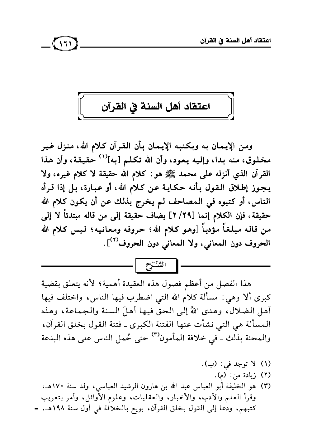 ومن الإيمان بالله وكتبه الإيمان بأن القرآن كلام الله منزل غير مخلوق، منه بدا، وإليه يعود، وأن الله تكلم [به] (¬1) حقيقة، وأن هذا القرآن الذي أنزله على محمد - صلى الله عليه وسلم - هو كلام الله حقيقة لا كلام غيره، ولا يجوز إطلاق القول بأنه حكاية عن كلام الله، أو عبارة، بل إذا قرأه الناس، أو كتبوه في المصاحف لم يخرج بذلك عن أن يكون كلام الله حقيقة، فإن الكلام إنما [29/ 2] يضاف حقيقة إلى من قاله مبتدئاً لا إلى من قاله مبلغاً مؤدياً، [وهو كلام الله؛ حروفه ومعانيه؛ ليس كلام الله الحروف دون المعاني، ولا المعاني دون الحروف] (¬2).