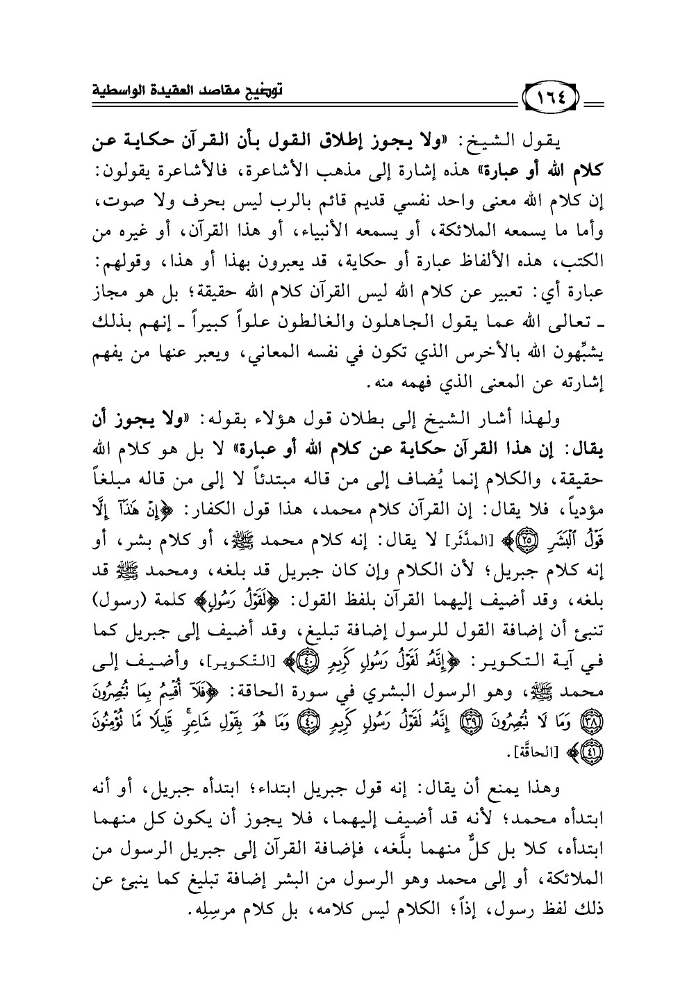 ولهذا أشار الشيخ إلى بطلان قول هؤلاء بقوله: "ولا يجوز أن يقال: إن هذا القرآن حكاية عن كلام الله أو عبارة " لا بل هو كلام الله حقيقة، والكلام إنما يُضاف إلى من قاله مبتدئا لا إلى من قاله مبلغا مؤديا، فلا يقال: إن القرآن كلام محمد، هذا قول الكفار {إِنْ هَذَا إِلَّا قَوْلُ الْبَشَرِ} [(25) سورة المدثر] لا يقال: إنه كلام محمد - صلى الله عليه وسلم -، أو كلام بشر، أو إنه كلام جبريل؛ لأن الكلام وإن كان جبريل قد بلغه ومحمد - صلى الله عليه وسلم - قد بلغه، وقد أضيف إليهما القرآن بلفظ القول {لَقَوْلُ رَسُولٍ} كلمة رسول تنبئ أن إضافة القول للرسول إضافة تبليغ {إِنَّهُ لَقَوْلُ رَسُولٍ} وقد أضيف إلى جبريل كما في آية التكوير {إِنَّهُ لَقَوْلُ رَسُولٍ كَرِيمٍ} [(19) سورة التكوير]، وأضيف إلى محمد - صلى الله عليه وسلم - وهو الرسول البشري في سورة الحاقة {فَلَا أُقْسِمُ بِمَا تُبْصِرُونَ * وَمَا لَا تُبْصِرُونَ * إِنَّهُ لَقَوْلُ رَسُولٍ كَرِيمٍ * وَمَا هُوَ بِقَوْلِ شَاعِرٍ قَلِيلًا مَا تُؤْمِنُونَ} [(38 - 41) سورة الحاقة].