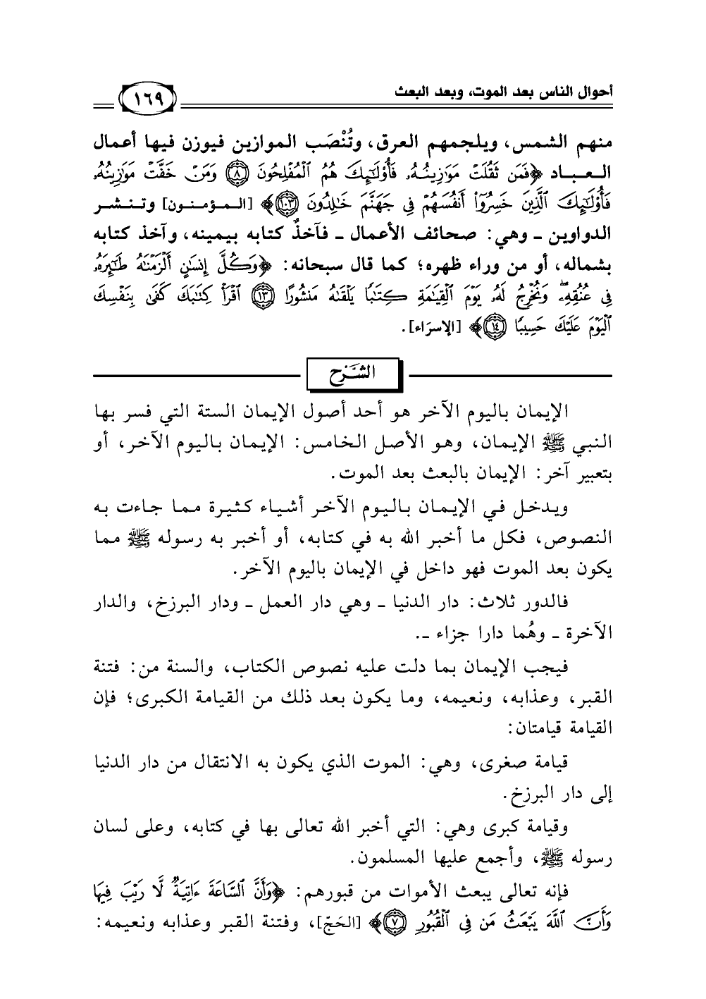منهم الشمس، ويلجمهم العرق، وتنصب الموازين فيوزن فيها أعمال العباد {فَمَنْ ثَقُلَتْ مَوَازِينُهُ فَأُولَئِكَ هُمُ الْمُفْلِحُونَ وَمَنْ خَفَّتْ مَوَازِينُهُ فَأُولَئِكَ الَّذِينَ خَسِرُوا أَنْفُسَهُمْ فِي جَهَنَّمَ خَالِدُونَ} وتنشر الدواوين ـ وهي صحائف الأعمال ـ فآخذٌ كتابه بيمينه، وآخذ كتابه بشماله، أو من وراء ظهره كما قال سبحانه {وَكُلَّ إِنسَانٍ أَلْزَمْنَاهُ طَآئِرَهُ فِي عُنُقِهِ وَنُخْرِجُ لَهُ يَوْمَ الْقِيَامَةِ كِتَابًا يَلْقَاهُ مَنشُورًا * اقْرَا كِتَابَكَ كَفَى بِنَفْسِكَ الْيَوْمَ عَلَيْكَ حَسِيبًا} [(13 - 14) سورة الإسراء] [30/ 1]