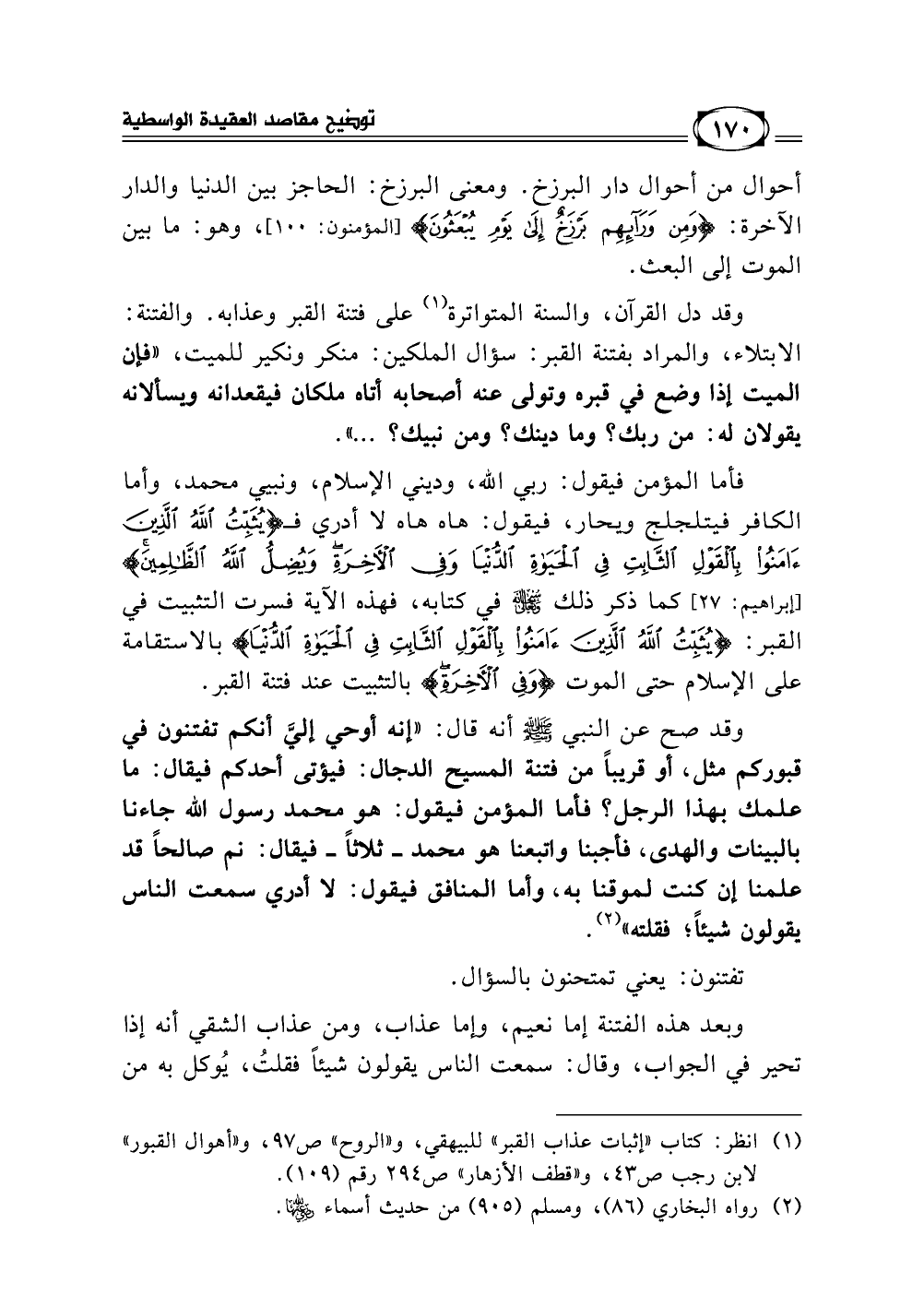 وقد دل القرآن، والسنة المتواترة (¬1) على فتنة القبر وعذابه. والفتنة: الابتلاء، والمراد بفتنة القبر: سؤال الملكين: منكر ونكير للميت " فإن الميت إذا وضع في قبره وتولى عنه أصحابه أتاه ملكان فيقعدانه ويسألانه يقولان له: من ربك؟ وما دينك؟ ومن نبيك؟