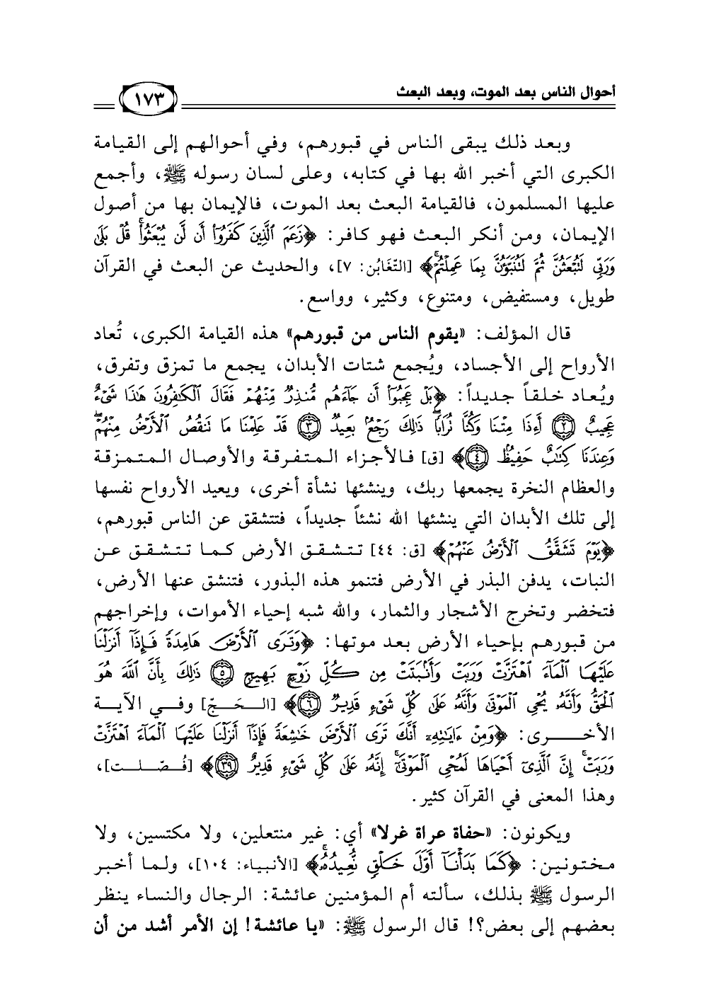 قال المؤلف"يقوم الناس من قبورهم" هذه القيامة الكبرى، تُعاد الأرواح إلى الأجساد، ويُجمع شتات الأبدان، يجمع ما تمزق وتفرق ويُعاد خلقا جديدا {فَقَالَ الْكَافِرُونَ هَذَا شَيْءٌ عَجِيبٌ * أَئِذَا مِتْنَا وَكُنَّا تُرَابًا ذَلِكَ رَجْعٌ بَعِيدٌ * قَدْ عَلِمْنَا مَا تَنْقُصُ الْأَرْضُ مِنْهُمْ وَعِنْدَنَا كِتَابٌ حَفِيظٌ} [(2 - 4) سورة ق] فالأجزاء المتفرقة والأوصال المتمزقة والعظام النخرة يجمعها ربك، وينشئها نشأة أخرى، ويعيد الأرواح نفسها إلى تلك الأبدان التي ينشئها الله نشئا جديدا، فتتشقق عن الناس قبورهم، {يَوْمَ تَشَقَّقُ الْأَرْضُ عَنْهُمْ} [(44) سورة ق] تتشقق الأرض كما تتشقق عن النبات، يدفن البذر في الأرض فتنمو هذه البذور فتنشق عنها الأرض، فتخضر وتخرج الأشجار والثمار، والله شبه إحياء الأموات وإخراجهم من قبورهم بإحياء الأرض بعد موتها {وَتَرَى الْأَرْضَ هَامِدَةً فَإِذَا أَنزَلْنَا عَلَيْهَا الْمَاء اهْتَزَّتْ وَرَبَتْ وَأَنبَتَتْ مِن كُلِّ زَوْجٍ بَهِيجٍ * ذَلِكَ بِأَنَّ اللَّهَ هُوَ الْحَقُّ وَأَنَّهُ يُحْيِي الْمَوْتَى وَأَنَّهُ عَلَى كُلِّ شَيْءٍ قَدِيرٌ} [(5 - 6) سورة الحج] وفي الآية الأخرى {وَمِنْ آيَاتِهِ أَنَّكَ تَرَى الْأَرْضَ خَاشِعَةً فَإِذَا أَنزَلْنَا عَلَيْهَا الْمَاء اهْتَزَّتْ وَرَبَتْ إِنَّ الَّذِي أَحْيَاهَا لَمُحْيِي الْمَوْتَى إِنَّهُ عَلَى كُلِّ شَيْءٍ قَدِيرٌ} [(39) سورة فصلت] وهذا المعنى في القرآن كثير.