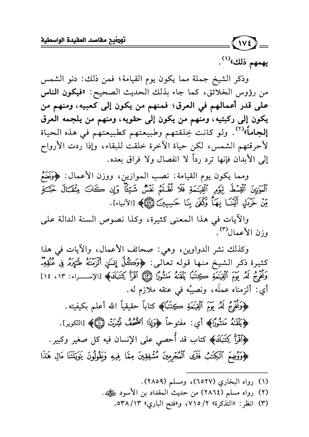 وذكر الشيخ جملة مما يكون يوم القيامة فمن ذلك: دنو الشمس من رؤوس الخلائق، كما جاء بذلك الحديث الصحيح:" فيكون الناس على قدر أعمالهم في العرق؛ فمنهم من يكون إلى كعبيه، ومنهم من يكون إلى ركبتيه، ومنهم من يكون إلى حقويه، ومنهم من يلجمه العرق إلجاما " (¬2). ولو كانت خِلقتهم وطبيعتهم كطبيعتهم في هذه الحياة لأحرقتهم الشمس، لكن حياة الآخرة خلقت للبقاء، وإذا ردت الأرواح إلى الأبدان فإنها ترد ردا لا انفصال، ولا فراق بعده.