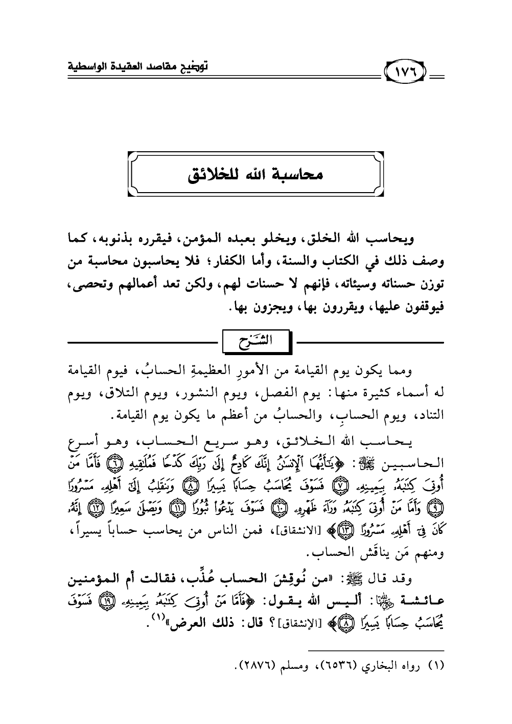 ويحاسب الله الخلق، ويخلو بعبده المؤمن، فيقرره بذنوبه، كما وصف ذلك في الكتاب والسنة، وأما الكفار؛ فلا يحاسبون محاسبة من توزن حسناته وسيئاته، فإنهم لا حسنات لهم، ولكن تعد أعمالهم وتحصى، فيوقفون عليها، ويقررون بها، ويجزون بها.