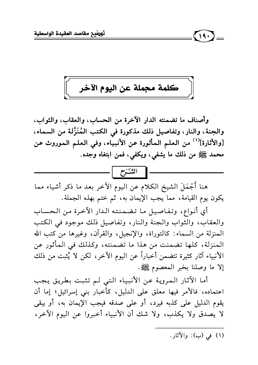 هنا أَجْمَلَ الشيخ الكلام عن اليوم الآخر بعد ما ذكر أشياء مما يكون يوم القيامة، مما يجب الإيمان به، ثم ختم بهذه الجملة.