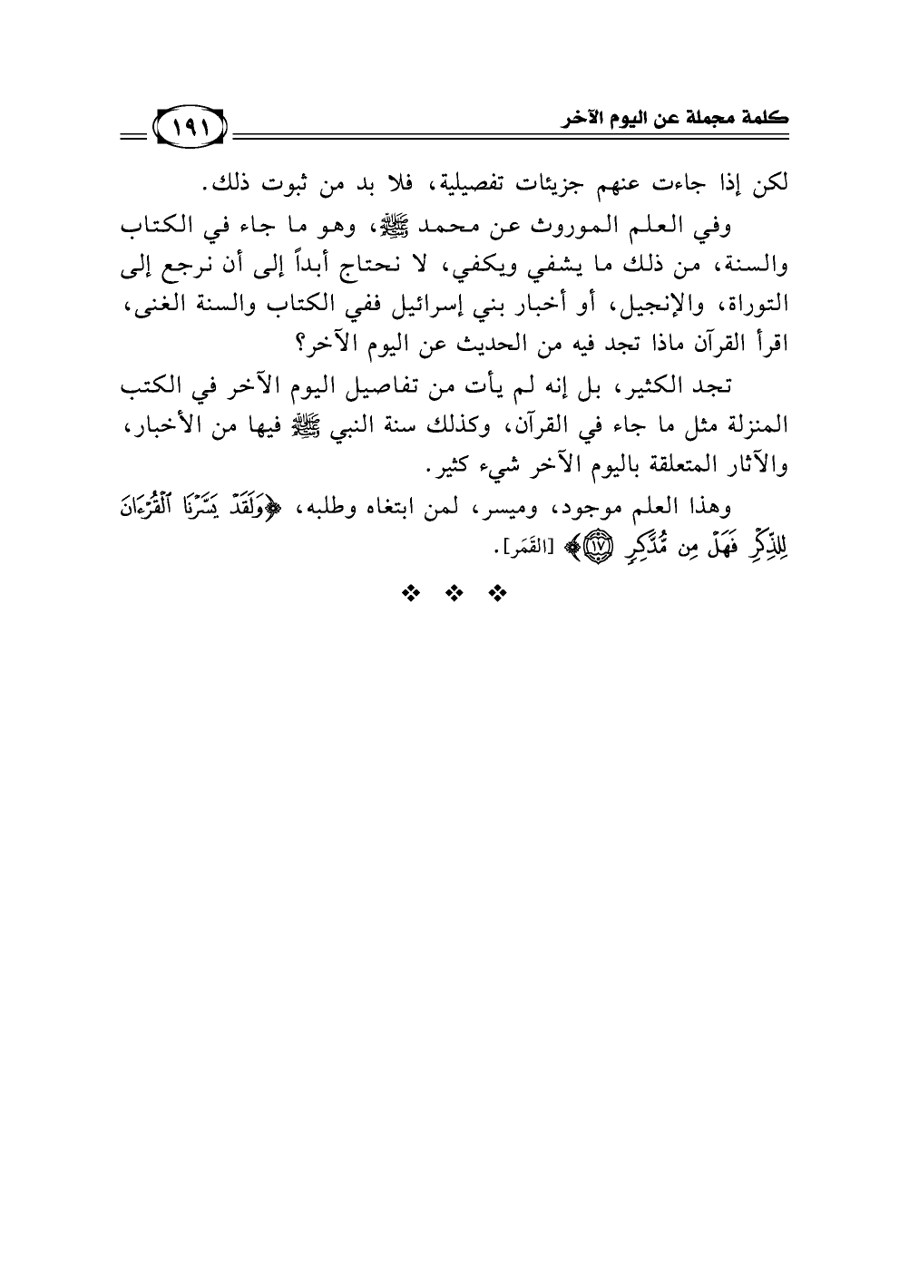 وفي العلم الموروث عن محمد - صلى الله عليه وسلم -، وهو ما جاء في الكتاب والسنة، من ذلك ما يشفي ويكفي، لا نحتاج أبدا إلى أن نرجع إلى التوراة والإنجيل، أو أخبار بني إسرائيل ففي الكتاب والسنة الغنى، اقرأ القرآن ماذا تجد فيه من الحديث عن اليوم الآخر؟