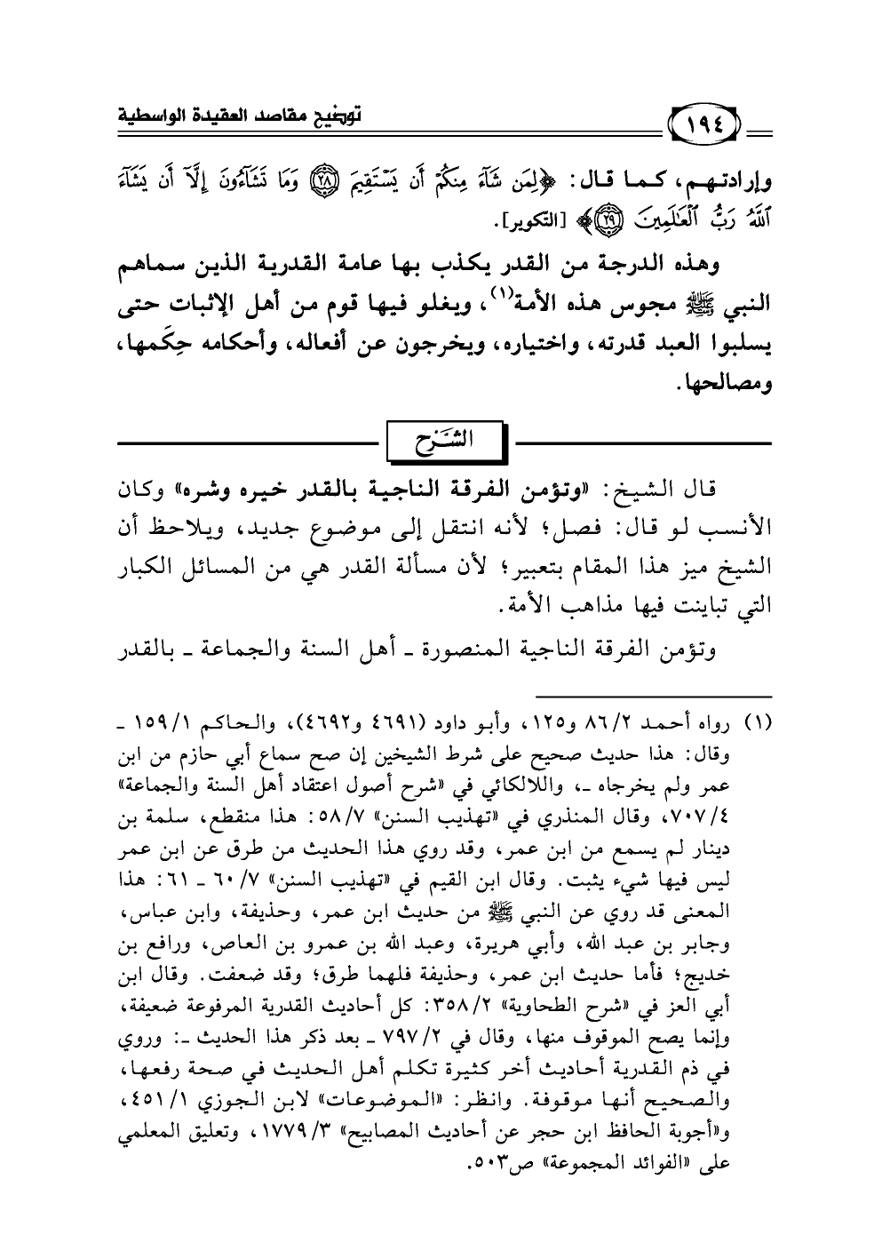 قال الشيخ: "وتؤمن الفرقة الناجية بالقدر خيره وشره" وكان الأنسب لو قال: فصل؛ لأنه انتقل إلى الموضوع جديد، ويلاحظ أن الشيخ ميز هذا المقام بتعبير؛ لأن مسالة القدر هي من المسائل الكبار التي تباينت فيها مذاهب الأمة.