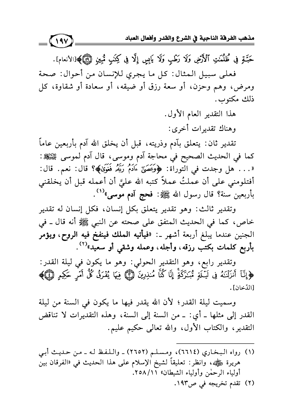 وتقدير ثالث: وهو تقدير يتعلق بكل إنسان، فكل إنسان له تقدير خاص، كما في الحديث المتفق على صحته عن النبي - صلى الله عليه وسلم -:" أنه قال ـ في الجنين عندما يبلغ أربعة أشهر ـ: فيأتيه الملك فينفخ فيه الروح، ويؤمر بأربع كلمات بكتب رزقه وأجله وعمله وشقي أو سعيد (¬2).