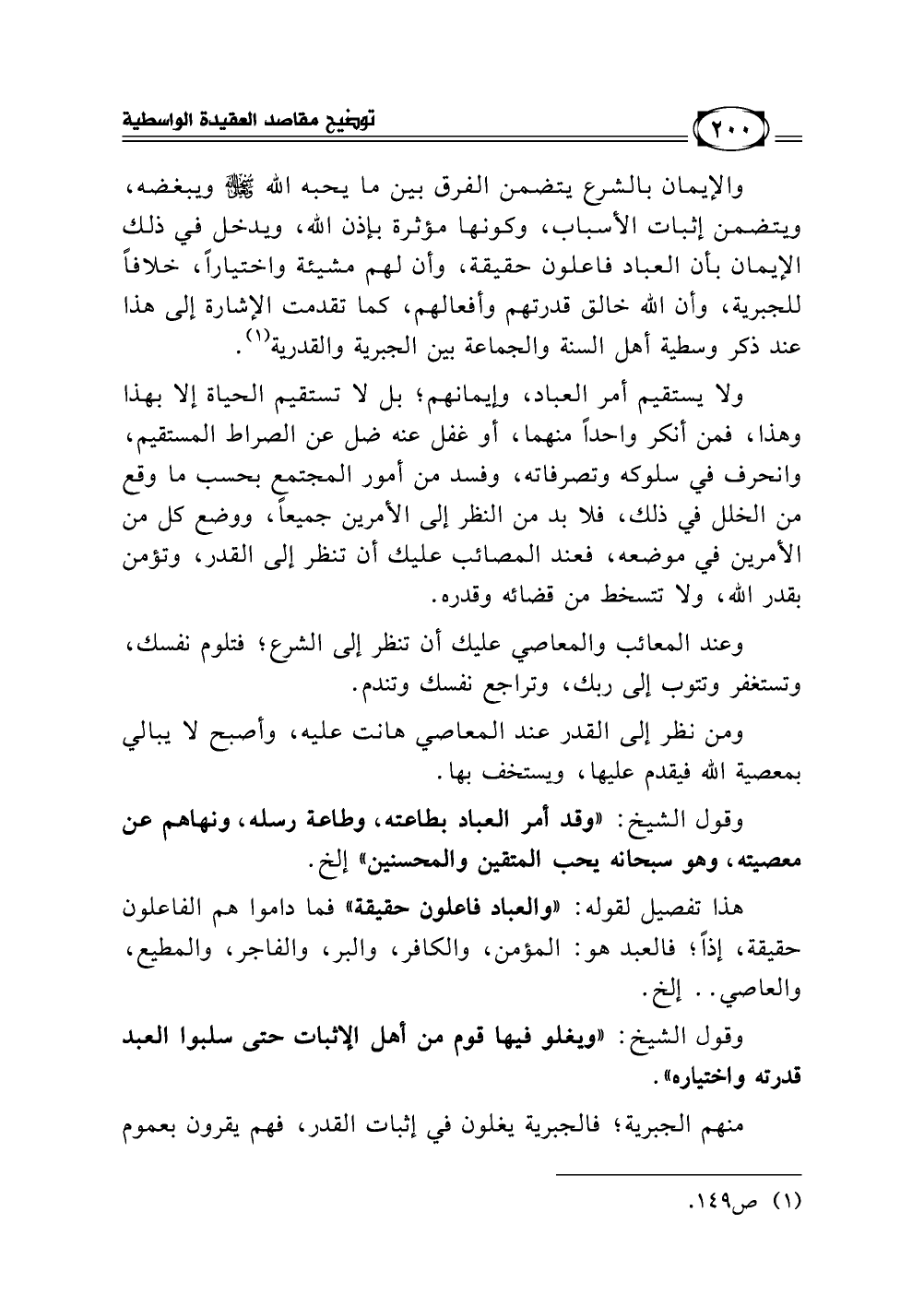 وقول الشيخ: "ويغلو فيها قوم من أهل الإثبات حتى سلبوا العبد قدرته واختياره ".